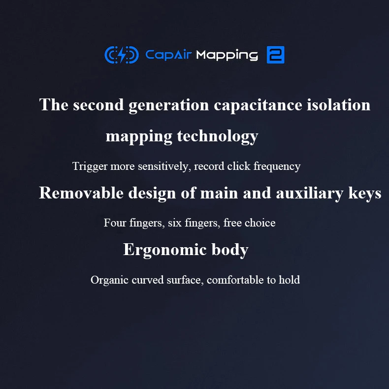 Технология сопоставления изоляции ёмкости второго поколения ручная скорость может быть записана, чувствительна, а затем прорывный триггер более чутко реагирует на каждый клик технология сопоставления изоляции конденсатора второго поколения использует более мощный чип второго поколения, что ближе к контакту и скорость отклика значительно улучшается. Проводящий силикон добавляется к контактной поверхности, чтобы убедиться, что каждый клик точно сообщен расположение чипа перемещается на кнопку записи головки нажмите частоту воспроизведения замечательных операций CapAir Mapping 2 С новой функцией ручной записи переключите верхний переключатель в режим записи/воспроизведения, вы можете записывать частоту нажатия и долго нажимать кнопку в реальном бою, чтобы воспроизвести