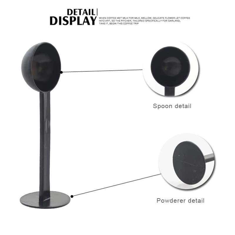 Один конец используется для черпающих бобов, а другой конец может быть использован для выравнивания порошка, когда заполнен горшок мокко, и может быть помещен в вертикальном положении на столе.