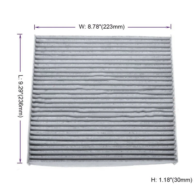Преимущества: (1) уменьшение не менее 98% этих загрязняющих веществ (пыли, выхлопных газов, частиц микрометров 5-100 и т. Д.) от воздуха, проходящего через фильтр и входящего во внутреннюю часть транспортного средства. (2) фильтр кабины с активированным углем обеспечивает дополнительную защиту, впитывая частицы пыли в воздухе. (3) Повышение безопасности за счет уменьшения отложений в вентиляторе или на ветровом стекле и защита производительности кондиционера HVAC
