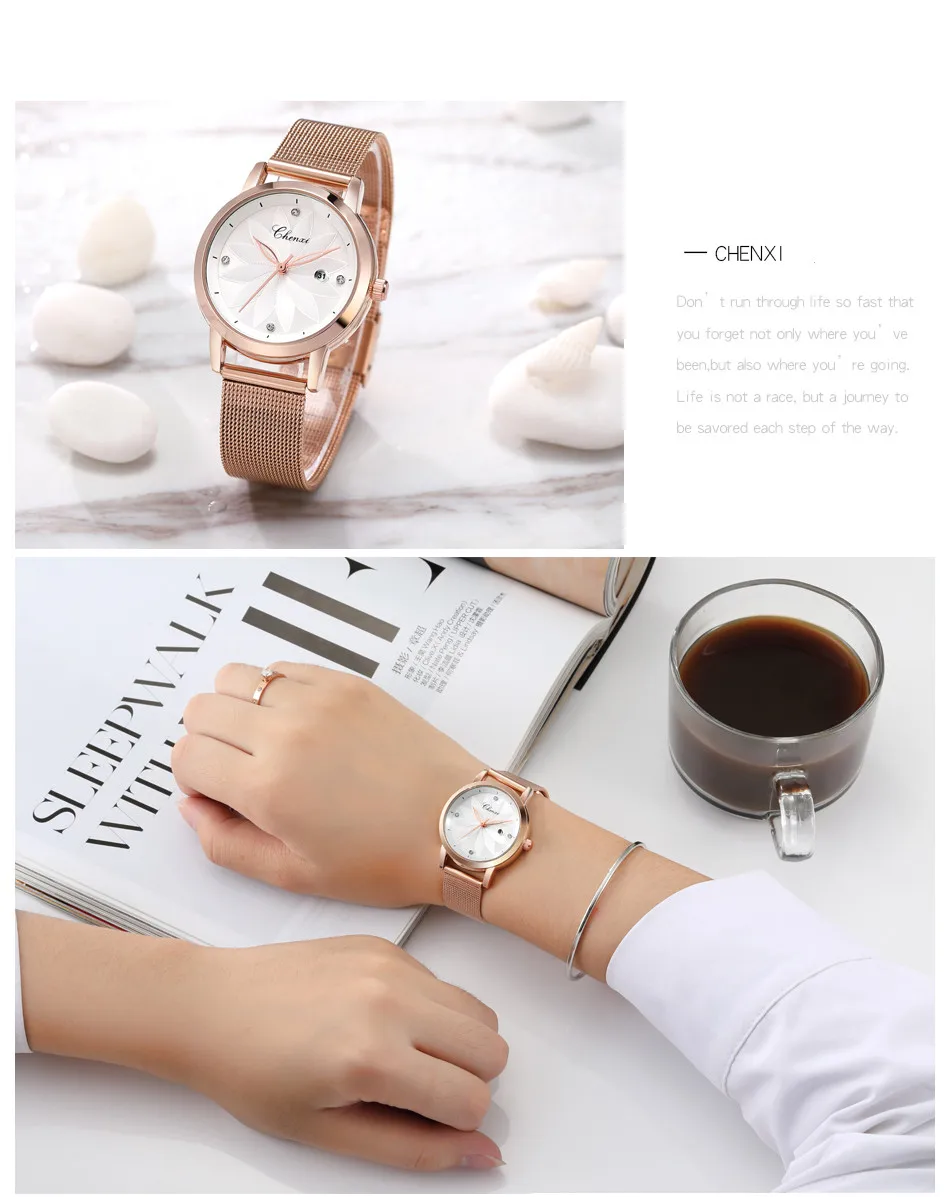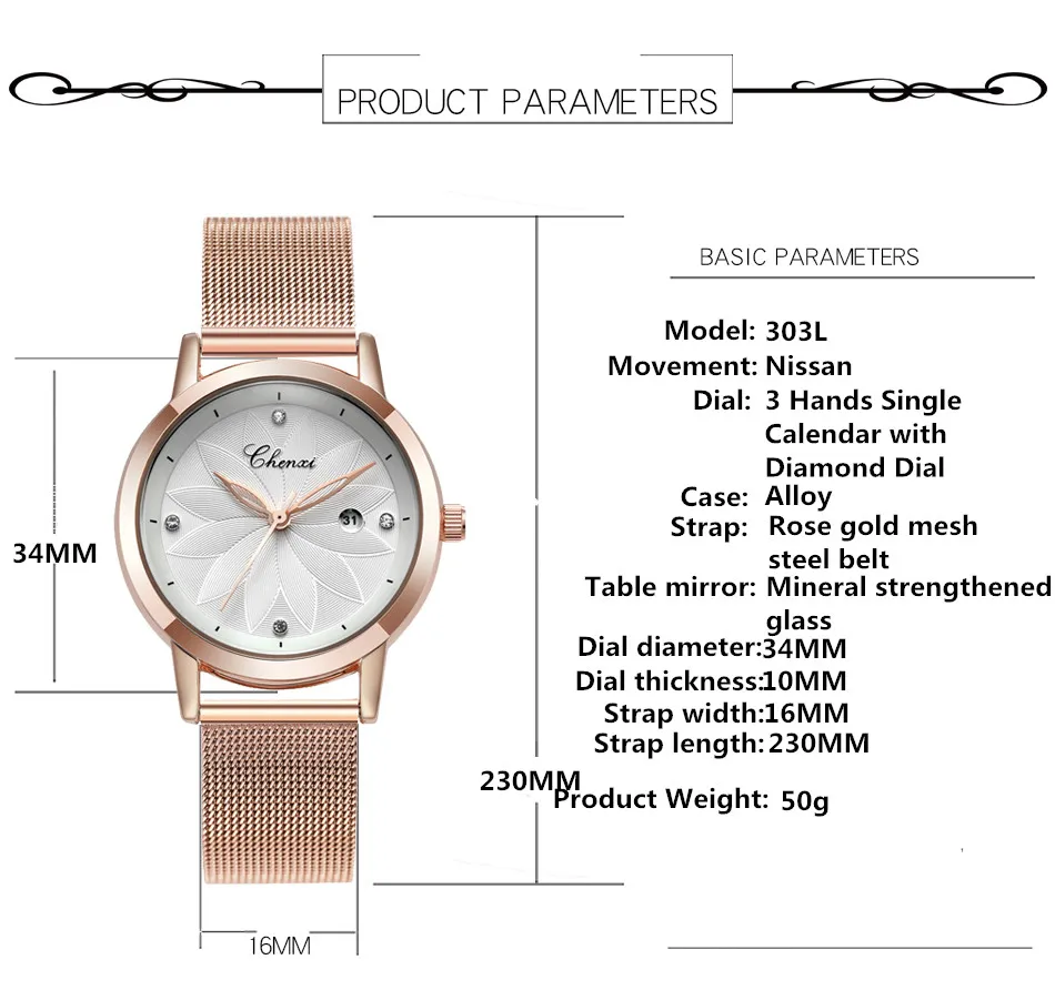 Бренд: CHENXI Watchtype механизм: кварцевый Материал: высококачественная нержавеющая сталь Циферблат: укрепленное минеральное стекло Часы Размеры: Длина ремешка часов: 230 мм Ширина ремешка часов: 16 мм Диаметр циферблата часов: 34 мм Чехол для часов, толщина: 10 мм Вес часов: 50 г