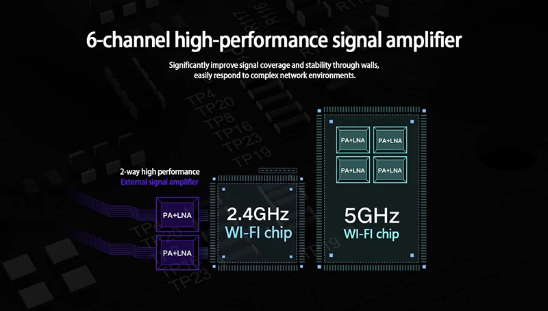 2,4 ГГц оснащен 2 внешних высокопроизводительный усилители сигнала (PA) и высокой чувствительности сигнал приемника (LNA).![]()