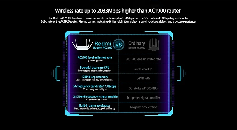 Двухдиапазонная Беспроводная скорость передачи данных Redmi AC2100 до 2033Mbp