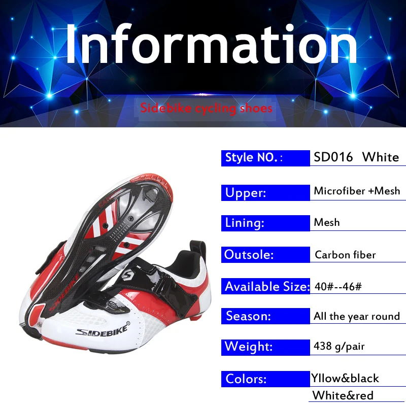 Обувь для велоспорта SIDEBIKE из углеродистой стали, Триатлон, профессиональный, дышащий, ультра-светильник, для шоссейного велосипеда, кроссовки, самоблокирующиеся, гоночная обувьОписание обуви для дорожного велосипеда:1. Эргономичные подошвы и стельки для улучшения комфорта и производительности2. Плюс нейлоновая термопластичная формовочная подошва из ТПУ обеспечивает надежное сцепление3. Термоформовочная Адаптивная верхняя часть может обеспечить сильную поддержку лодыжки и передней части стопы4. Улучшенная эргономичная стелька SL легкая, прочная, долговечная5. Нескользящий материал подкладки на каблуке, используемый в озере, обернутый каблук лучше, не легко упастьИнформация о продукте:Sapatilha ciclismo бренд: SIDEBIKEВелосипедные кроссовки Номер модели: SD-016-белыйВиды обуви: обувь для велоспортаОбувь для велоспорта Материал верха: сверхтонкая искусственная кожаZapatillas ciclismo материал подошвы: углеродное волокноСтелька для обуви ciclismo: верхняя воздушная подушкаSapatilha mtb верхняя структура: бесшовный инженерный Механический дизайнСистема соединения Chaussure vtt: SPDScarpe ciclismo цвета: черный/белыйРазмер велосипедной обуви: 40/41/42/43/44/45/46Функция:Обувь для шоссейного велосипеда подходит для скоростной езды, быстрой езды на велосипеде, например, пустой, флип или прыжки и т. д.; светильник скоростной 3D подошвы, позволяет носить автомобиль ребенок в грязи может работать быстро.Посылка включает: