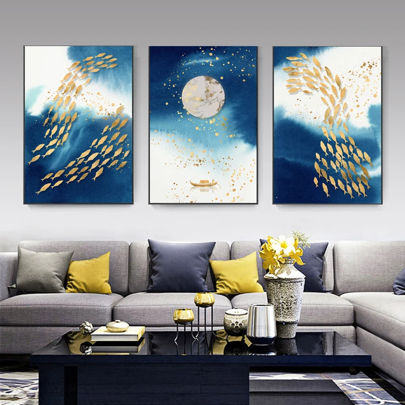 Золотая Рыба и луна Ночная настенная живопись холст Абстрактные плакаты печать настенные картины для гостиной домашний декор
