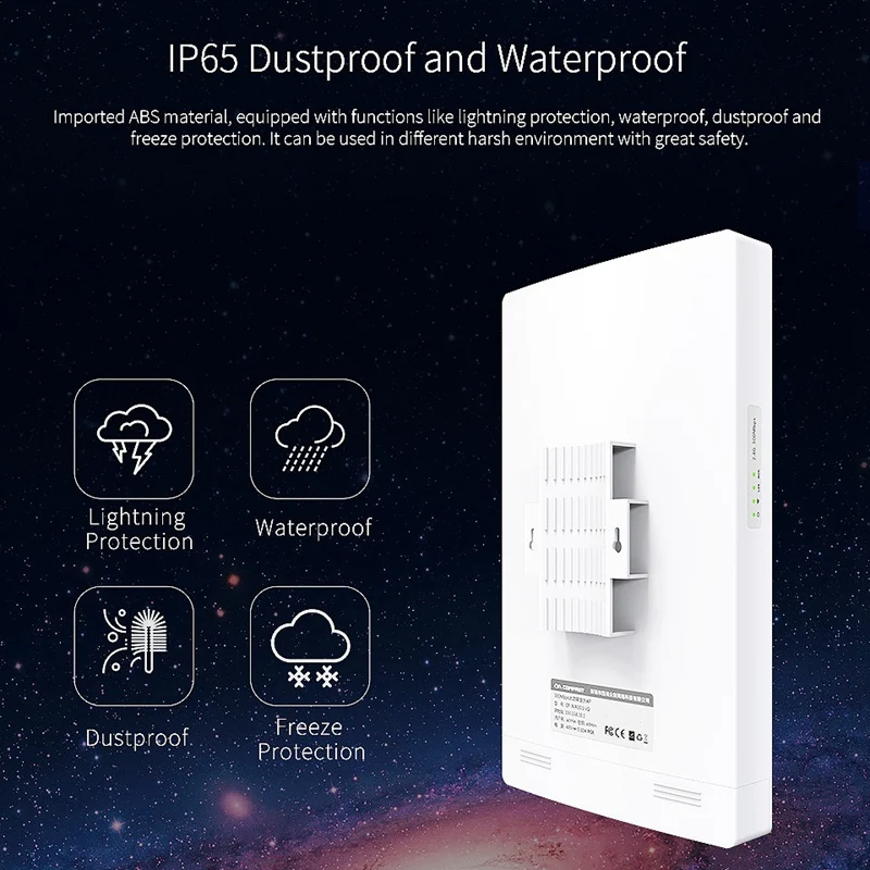 Импортный внешний вид из АБС-пластика, для защиты интерфейса Apple, водонепроницаемый, солнцезащитный и морозостойкий, с высокой безопасностью; Схема промышленного чипа Qualcomm AR9341, встроенный чип усилителя мощности PA для усиления сигнала; Чип Watchdog, автоматический ремонт, больше беспокойства, конфигурация антенны с высоким коэффициентом усиления 13dBi, покрытие большой площади;