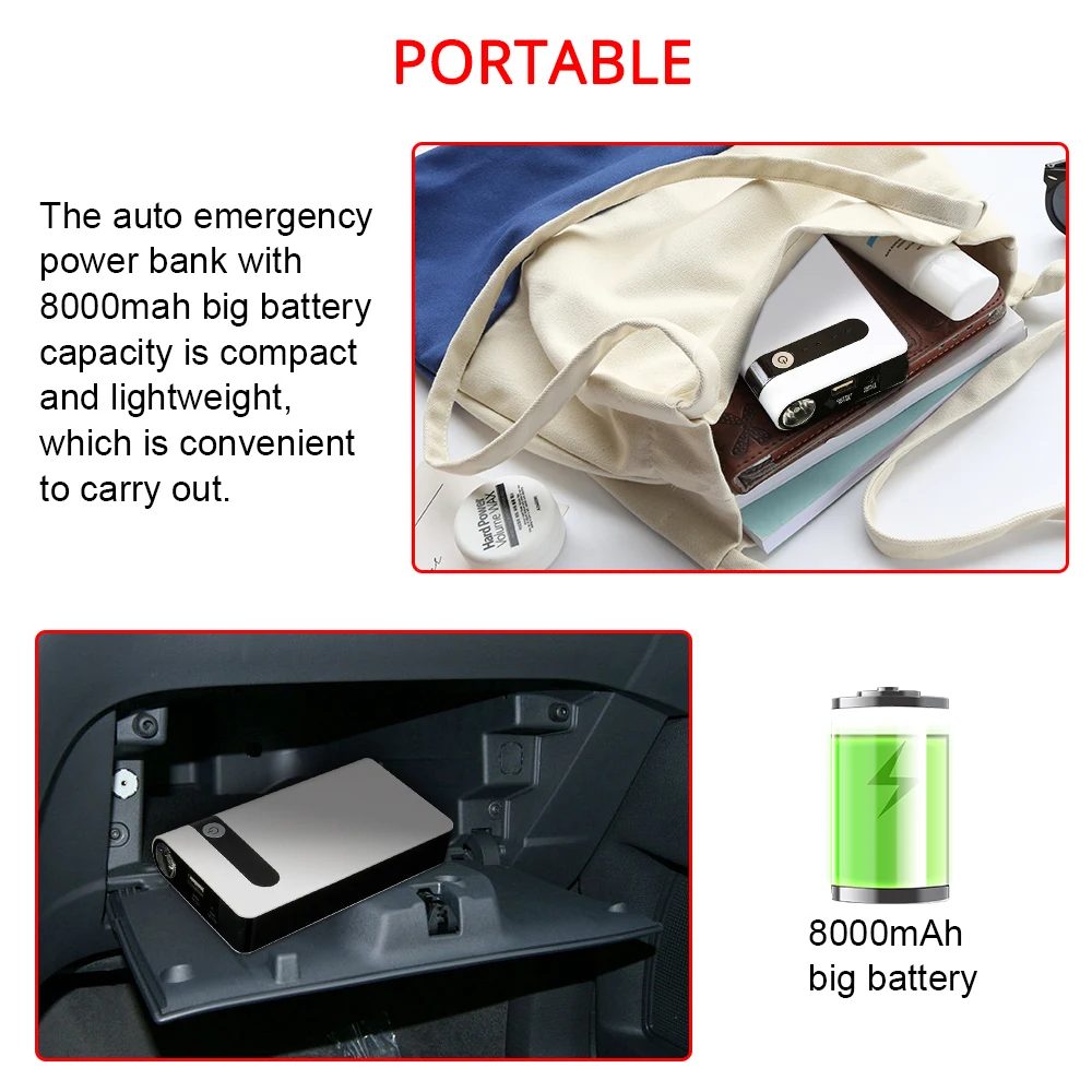 5,19*2,95*0,98 дюйма (L * W * H) авто аварийный power bank с 8000 мА/ч, большая емкость батареи компактный и легкий, удобно носить с собой.