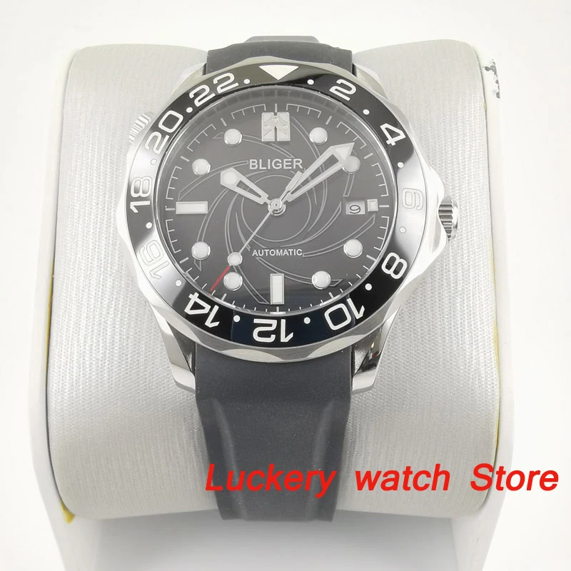 Механизм: автоматический (самонамоточный) механизм Циферблат: черный циферблат; Светящиеся стрелки и отметки; Керамический ободок Материал корпуса: твердый корпус из нержавеющей стали 316L. Водонепроницаемость 30 м. Размер Чехла: диаметр: 41 мм; Толщина: 14,1 мм. Ремешок: 20 мм Ширина резиновый ремешок. Тип застежки: раскладная застежка из нержавеющей стали. Стекло: сапфировое стекло. Функция: Дата отображается в 3 часа