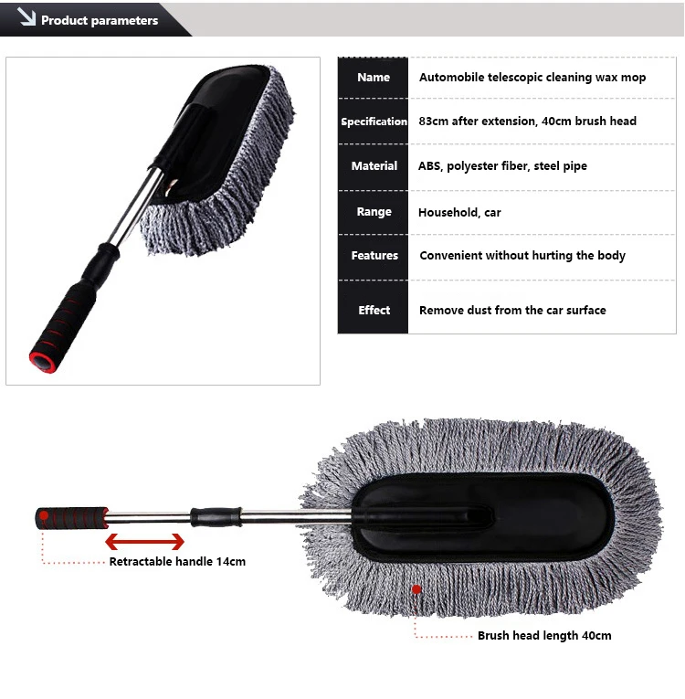 Название: автомобильная телескопическая мойка, восковая Швабра Технические характеристики: 83 см после удлинения, 40 см головка кисти Материал: АБС, полиэфирное волокно, стальная труба Область применения: бытовая, автомобильная Роль: удаление пыли на поверхности автомобиля