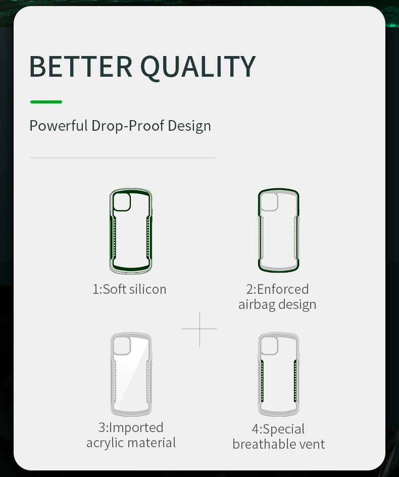 -Совместимость с iphone 7/ 7P/ 8/8P/SE2 -Цвет: черный, зеленый, красный -SGS падения Сертификация -Защита, подушка безопасности дизайн -Импортный акриловый материал: предотвращает появление отпечатков пальцев и пожелтение. -Индивидуальная Кнопка обеспечивает точное сотрудничество. -0,8 мм Усовершенствованный дизайн может защитить вашу Экран и Камера от царапин. -Сделайте этот чехол в соответствии с реальным телефоном, убедитесь, что отверстия идеально совпадают.