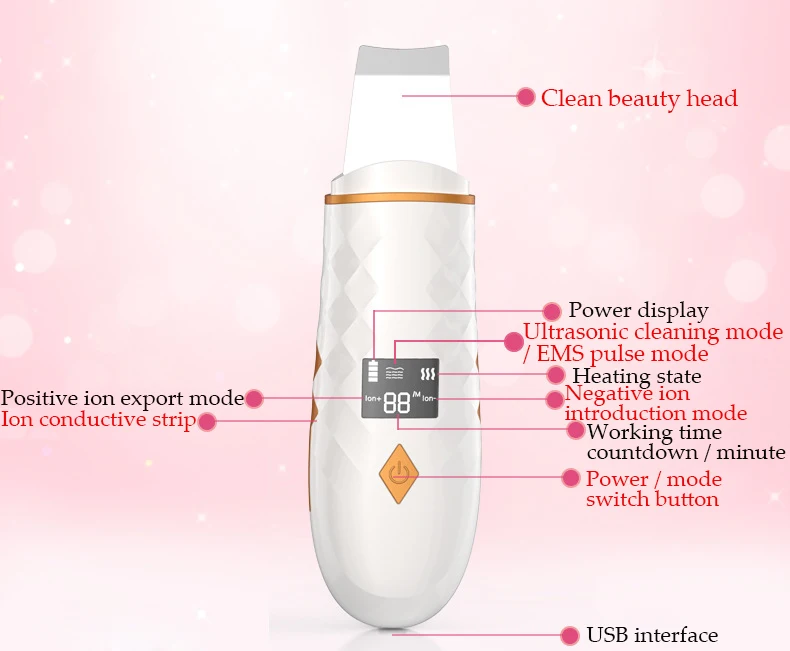 Материал изделия: абс + лопата из нержавеющей стали Технические характеристики: светодиодный дисплей с большим экраном, индикатор питания, ультразвуковой, EMS, положительные и отрицательные ионы, двухкристаллический нагрев Использование: очистка пор, черных точек и акне, смазка и грязь, уход за лицом, импорт питания, чистый экспорт Применение: салон красоты и продукты личной гигиены кожи Способ зарядки: usb-интерфейс Напряжение зарядки: 5 В постоянного тока Рабочее напряжение: 3,7 В Номинальная мощность: 4 Вт Емкость аккумулятора: 600 мАч Время работы: 90 мин Вес нетто: около 80 г Размер изделия: 167*50*17 мм