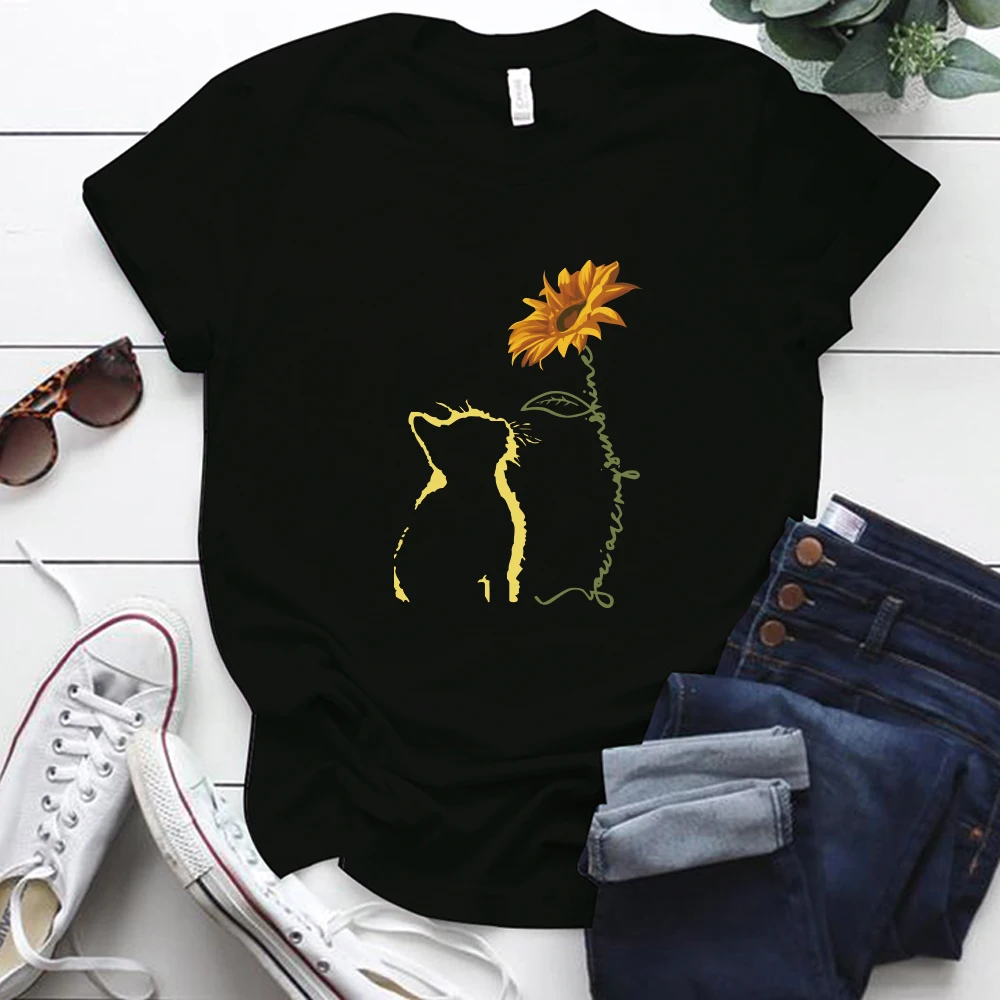 Женские Забавные футболки с принтом кота и подсолнуха, свободные топы с круглым вырезом, женские топы S-5XL размера плюс, женские рубашки, одежда, Camiseta Mujer