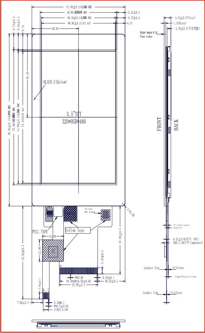1. ЖК-дисплей Название: 3,5 дюймов 320*480, ILI9488, MCU и интерфейсом RGB, высокая яркость, ЖК-дисплей с ёмкостный сенсорный панель 2. Часть №: 3. Размеры. : 3,5 дюймов 4. С сенсорной панелью или нет: Да 5. Тип касания: емкостный 6. Тип дисплея: IPS 7. Цвета дисплея: 65K/262K 8. Разрешение (пиксели): 320(RGB)* 480 9. Шаг пикселей: 0,153 (В) * 0,153 (В) 10. Направление просмотра: все 11. Контроллер IC: ILI9488 12. Режим отображения: переходящий/нормально черный 13. Общий размер: 55,5*84,96*4,25 мм 14. Область просмотра: 15. Активная область: 48,96 (В) * 73,44 (В) 16. Яркость: 340cd/m2 17. Контрастность: 500 Интерфейс Тип: 8/9/16/18BIT MCU Интерфейс 3/4SPI + 16/18Bit RGB Интерфейс 3-производственная линия/Оборудование для 4-строчный последовательный интерфейс 18. Контактный номер : 50 шпильки 19. Высота штифта: 0,5 мм 20. Тип подключения: Тип подключения 21. Вход напряжение: 3,3 V 22. Тип и цвет подсветки: светодиодный/белый 23. Подсветка: 8 светодиодный параллельный If = 150-160mA, Vf = 3,2 V 24. Светодиодный срок службы: 50000h CTP Особенности: 25. Принцип: проективный 26. Прозрачность: ≥ 85% 27. ДЫМКА: ≤ 3% 28. Твердость: ≥ 6 ч 29. Экран: 30. Сенсорная точка: пять точек и жесты 31. Структура: G + G 32. Размер контура: 55,5*84,96*4,25 мм 33.VA Размер: 34. IC драйвера: FT5436 35. Интерфейс: I2C 36. Тип подключения: розетка 37. Контактный номер : 8 38. Высота штифта: 0,5 мм 39. Поддержка операционной системы: Linux, Android 40. Вход напряжение: 3,3 V 41. Диапазон рабочих температур: -20-70 °C 42. Диапазон температур хранения: -30-80 °C 43. Совместимость: RoHS 45. Сертификация регистрации: ISO9001 ISO13485 IATF16949