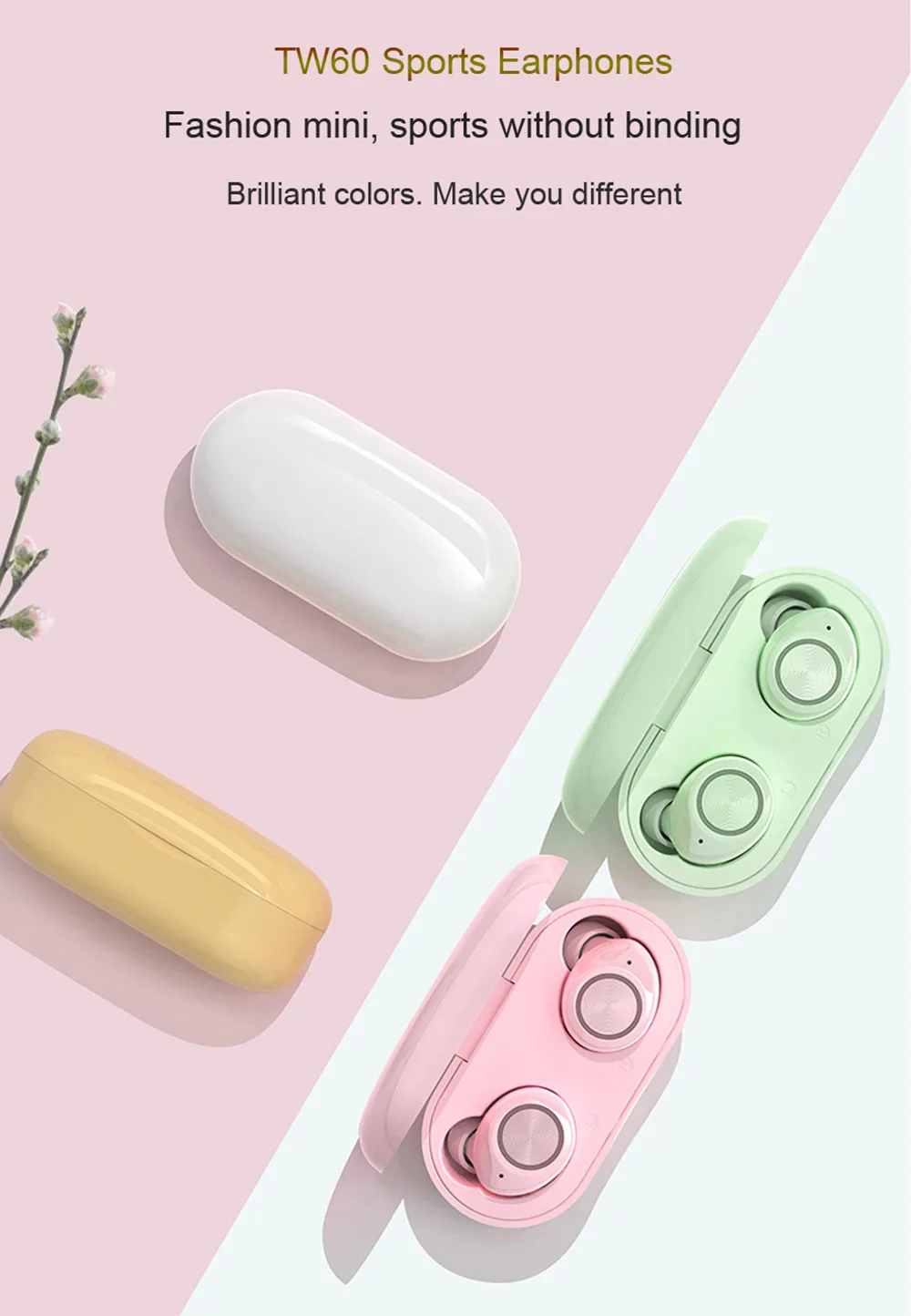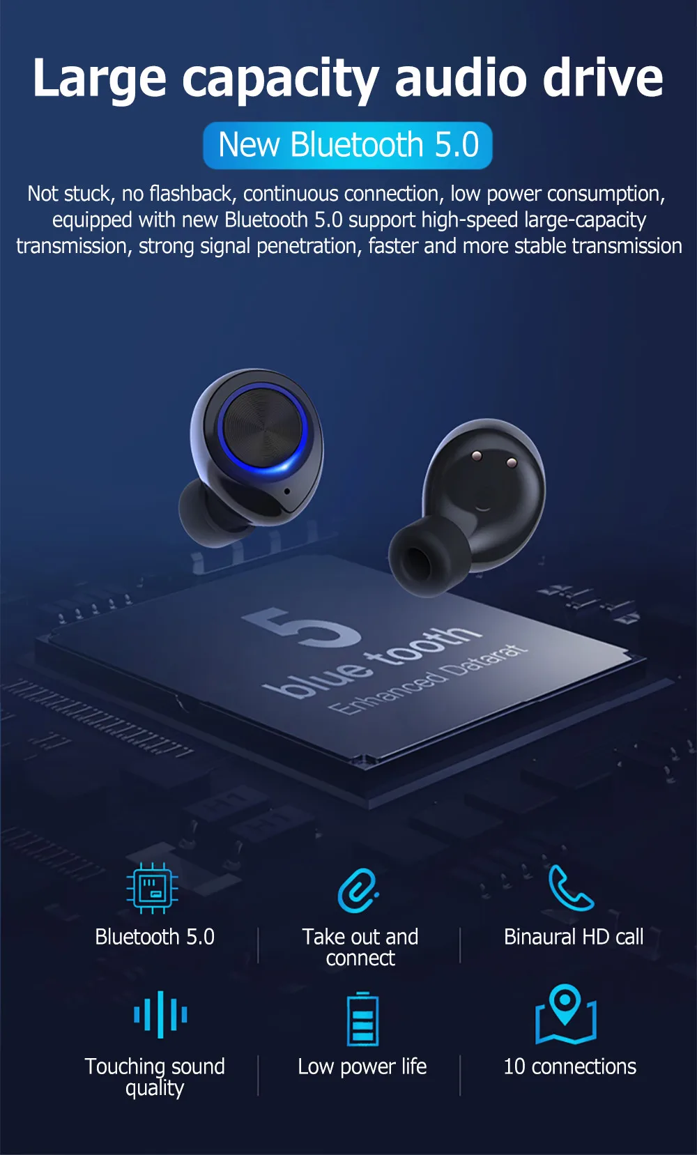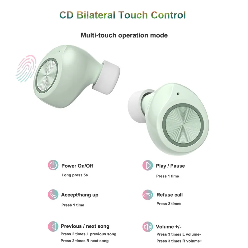 Сенсорное управление TW60 Нажмите: пауза/воспроизведение Нажмите: принять/отклонить Длительное нажатие, чтобы отклонить вызов Предыдущий трек: дважды нажмите на левое ухо Следующий трек: дважды нажмите на правое ухо Громкость +: Нажмите левое ухо 3 раза Громкость-: нажмите на правое ухо 3 раза Голос: Длительное нажатие в течение 3 секунд Параметры продукта 1. Чип: CSR V5.0 2. Эффективное расстояние прямой линии: 10 метров 3. Блок привода: высококачественный Графен динамик с диаметром динамика 6 мм. 4. Батарея: полимерная литиевая батарея, наушники 45 мАч, полностью кобальтовая батарея, зарядный отсек 400 мАч (с защитной панелью) 5. Время работы: 4 часа для одного наушника и 3 часа для обоих наушников. 6. Время работы в режиме ожидания: 100 Ч для одного наушника, 60 ч для обоих наушников 7. Время полной зарядки: около 70 минут для наушников, около 2 часов для зарядки чехол