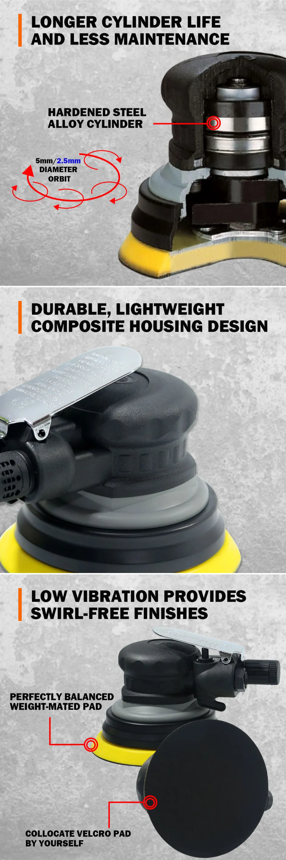 1. Низкая вибрация обеспечивает вихревые отделки. 2. Прочный, легкий композитный корпус 3. Низкопрофильная сбалансированная шлифовальная площадка в комплекте. 4. Сделано в Тайване с высоким качеством.