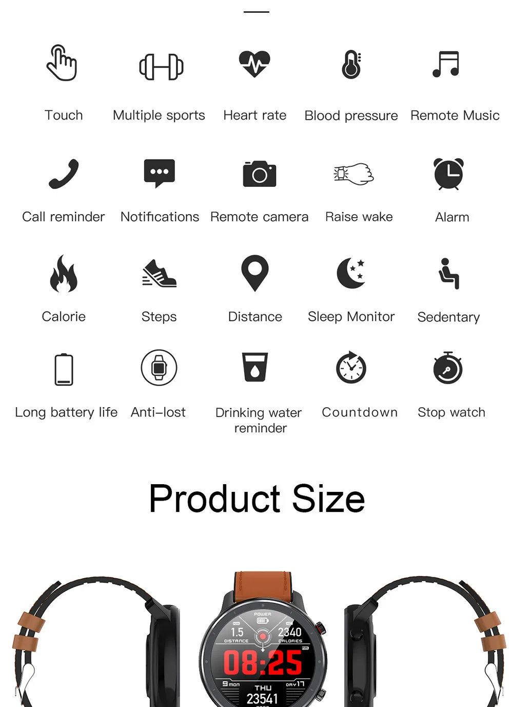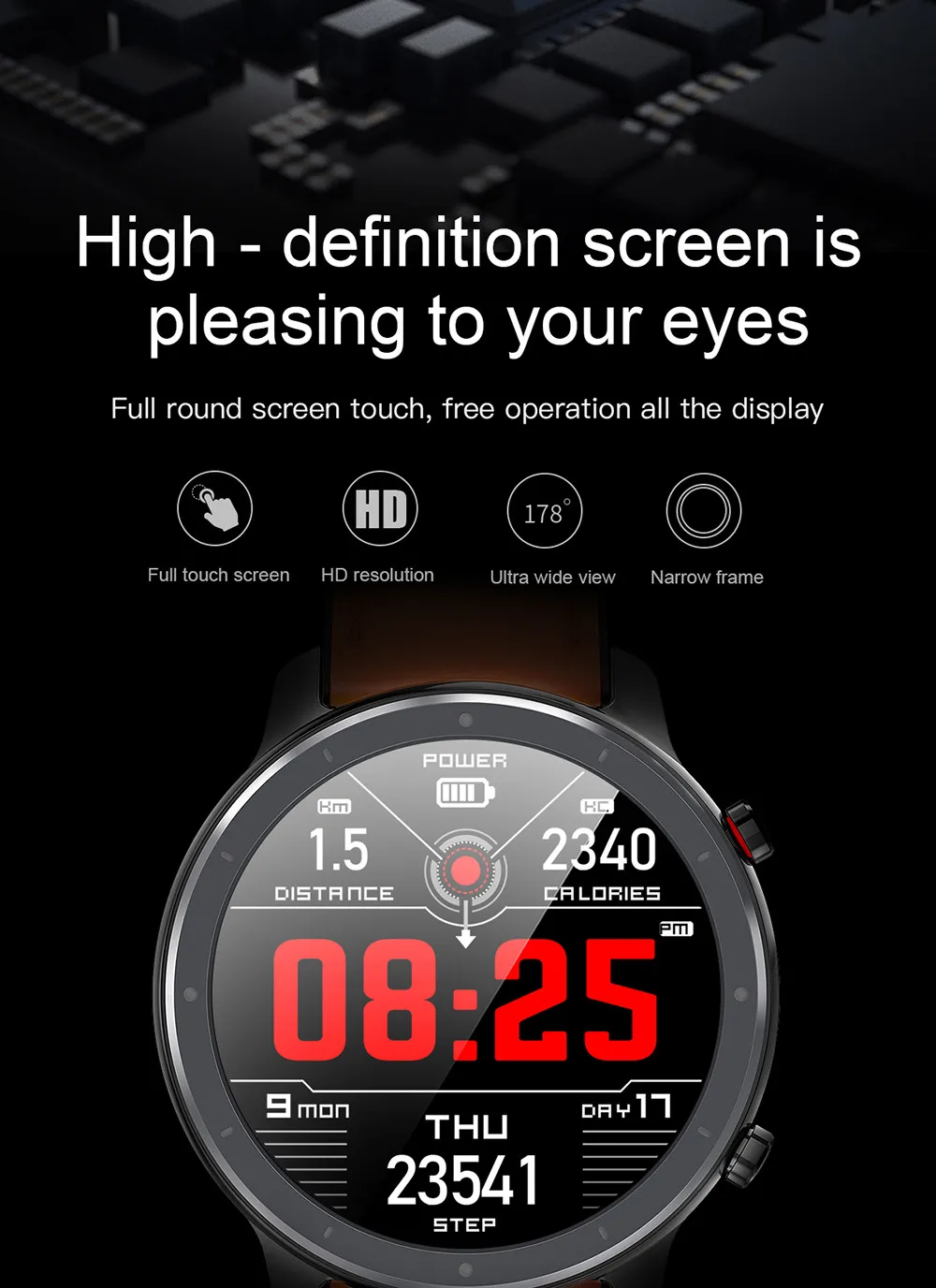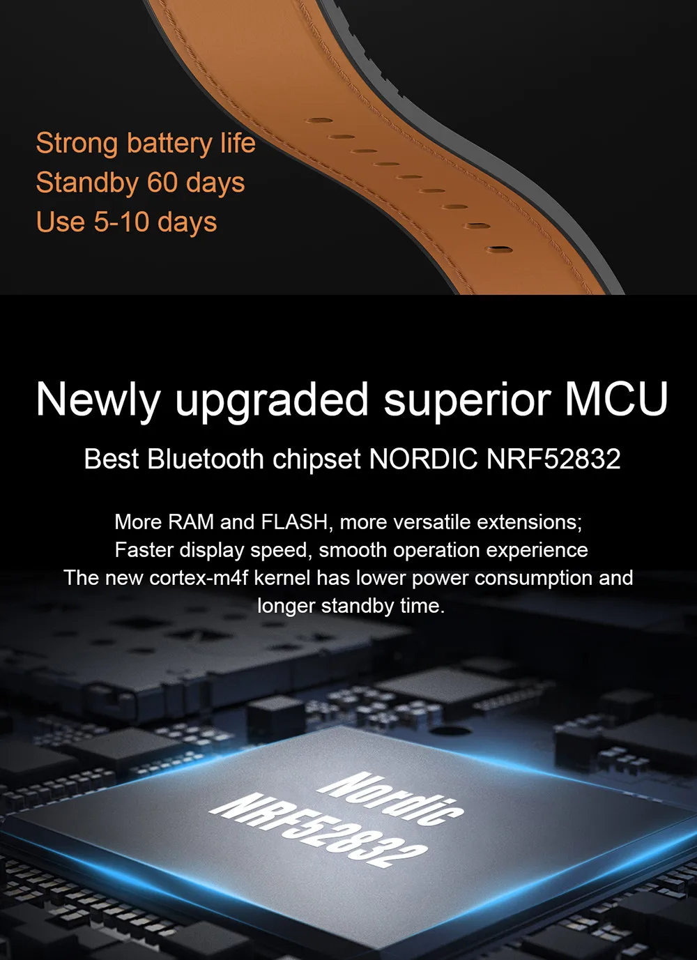 Чип процессора: скандинавский NRF52832 RAM: 64KB, ROM: 512кб + 64 Мб Экран Размер: 1,3 "TFT круглый полный сенсорный Экран 240*240 Водонепроницаемый: IP68 водонепроницаемый Bluetooth :Bluetooth 4,0 BLE Аккумулятор: 380 мАч (большой аккумулятор для вашего использования) Стандарт качества: GB4943.1-2011; ГБ/T22450.1-2008 Зарядка: магнитное зарядное устройство Название приложения: HealthDay