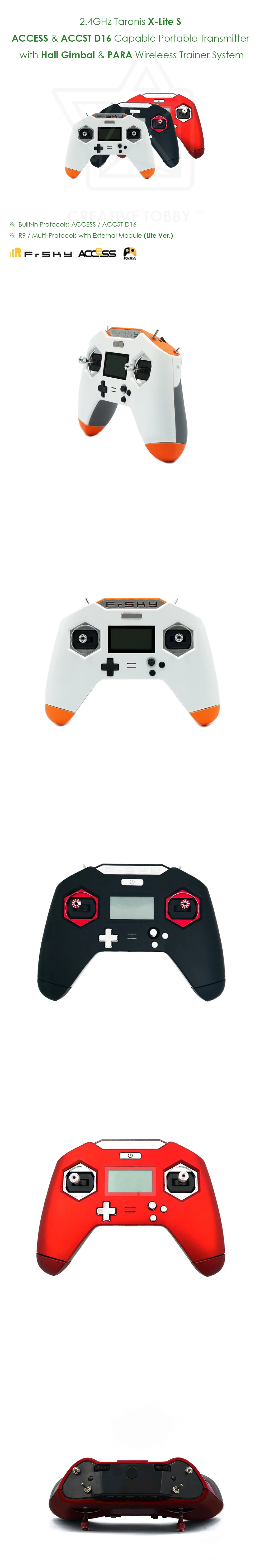 С растущим признанием нового компактного форм-фактора X-Lite FrSky представляет эту обновленную версию. Версии Pro и S сочетают все преимущества предыдущего дизайна с особенностями наших полноразмерных радиостанций, а также недавно разработанным протоколом доступа (расширенный Коммуникационный контроль, повышенный спектр распространения). Проверка airwaves на радиочастотный шум теперь возможна с новой функцией анализа спектра, добавленной в прошивку OpenTX. Версия S имеет дополнение функции беспроводного тренера PARA, что делает их совместимыми с приложением FrSky Free Link и AirLink S. Самое лучшее в модели S-это то, что пилоты теперь могут ожидать еще более низкой задержки и повышения производительности из-за нашего нового протокола передачи доступа. Интегрированным кнопкам прост в управлении 6-осевой блок датчика, пилоты могут использовать радио в качестве регулятора движения для управления входами модели во время полета или использовать его для установки камеры в нужном направлении. Как и все наши передатчики, все любимые функции от предыдущих Taranis включены, такие как полные Хаотичные Отзывы и голосовые оповещения, также установлены Телеметрия и 24 канала и дополнительные 2 мгновенные кнопки.