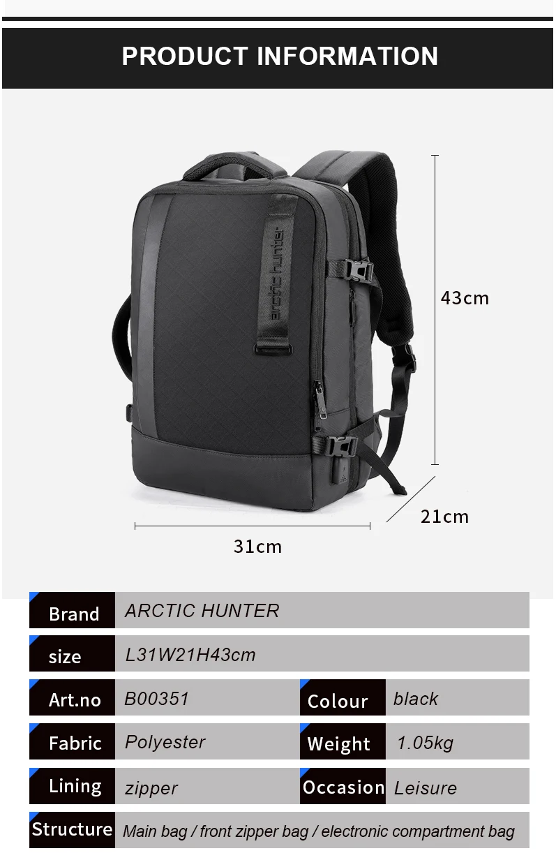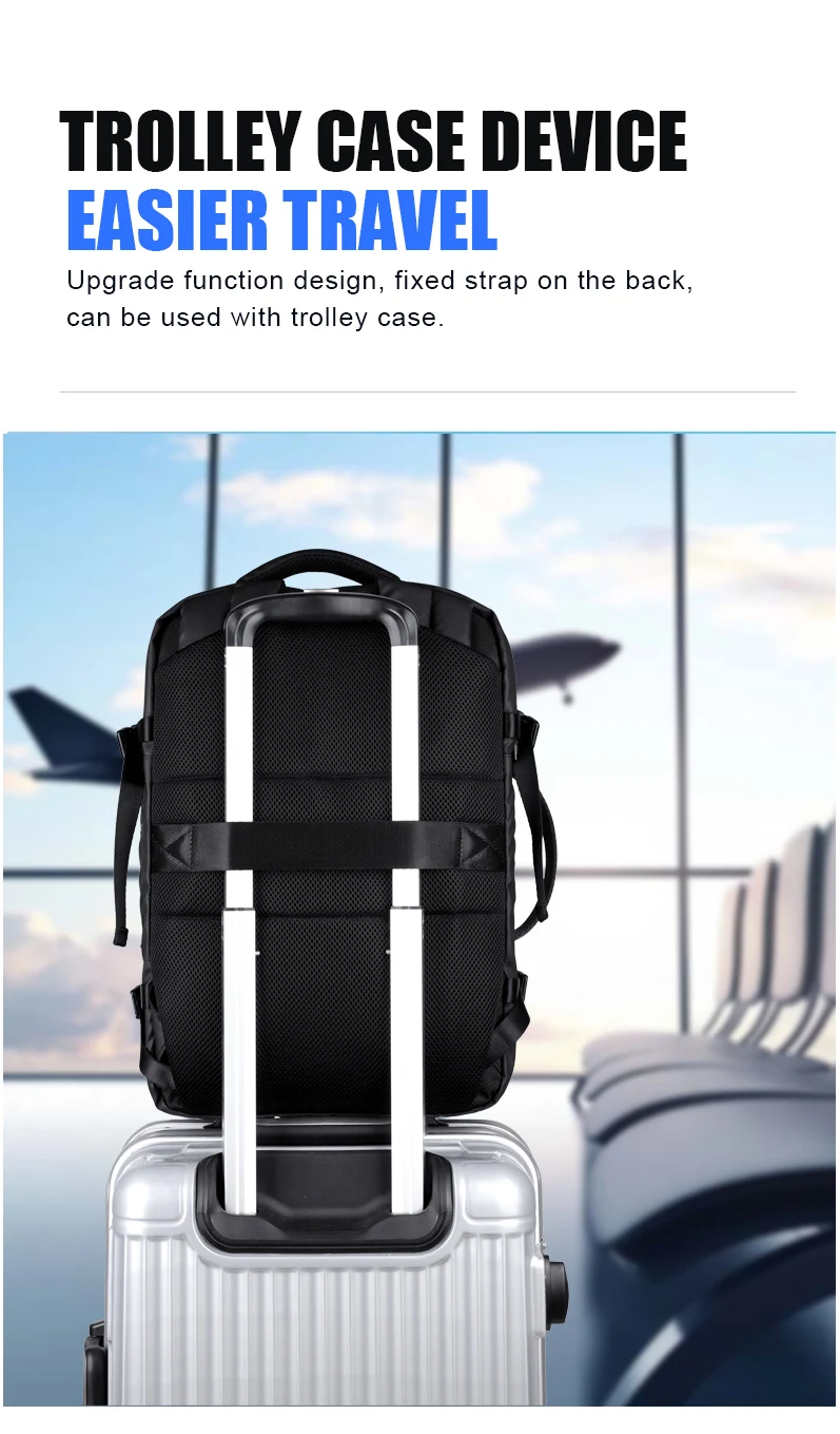 >180 ° full-open backpack suitcase, grid isolation, box structure. >Large-capacity main bag, digital storage compartment design. >External USB charging interface. >FEID shielding material. >Trolley box device. >Fit 17.3 inch laptop bacapacks. >Reflective tape at night. >Convenient bus pocket. >Adjust the fixed buckle.