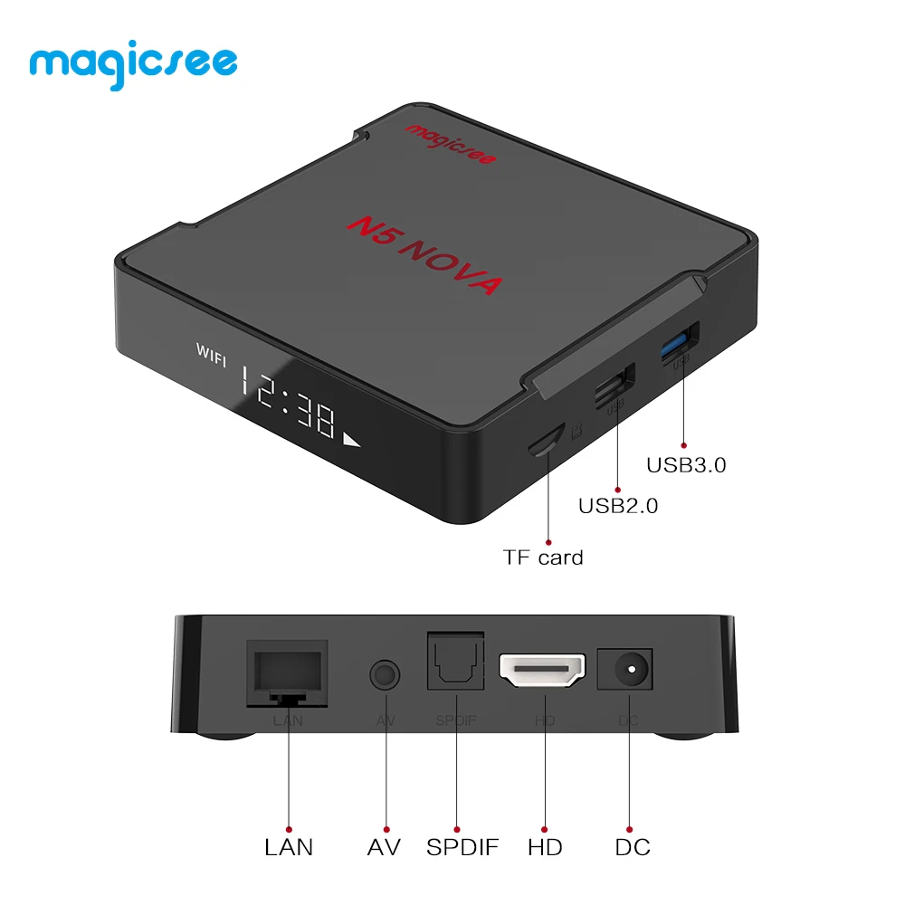 ОС: Android 9,0 Процессор: RK3318 четырёхъядерный 64-разрядный процессор ARM Cortex?- A53 GPU: Penta-Core Mali-450 Язык: китайский, английский, немецкий, тайский, французский, русский, итальянский, испанский .... Оперативная память: DDR 2 Гб ROM: eMMC flash 16 Гб Беспроводной Wi-Fi: 2,4 ГГц/5 ГГц IEEE 802.11a/b/g/n BT: 4,0 Ethernet: 100 м Vedio 4K VP9 видео декодер, H.264 видео декодер 1080P другие декодеры видео (VC-1, MPEG-1/2/4, VP6/8) Расширение программного обеспечения: Поддержка Google Play и установка APK Браузер изображений: Поддержка JPG, JPEG, BMP, GIF, PNG, JFIF... и т. Д. Формат фото I/O Usb-порт: 1 * USB2.0 + 1 * USB3.0 SPDIF: цифровой аудио HD: HD 2,0 A/V: OUT Ethernet Источник питания: 5V2A DC Слот для карты TF: для карты Micro SD (tf-карта) Светодиодный Дисплей: Поддержка Упаковочный лист 1 * N5NOVA TV Box 1 * HD кабель 1 * пульт дистанционного управления 1 * Руководство пользователя 1 * Подарочная коробка для упаковки 1 * Мощность адаптер