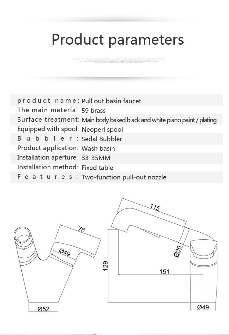 Название продукта: вытяжной кран для бассейна Основной материал: 59 латунь Обработка поверхности: основной запеченный черный и белый фортепиано краска/покрытие Оснащен КАТУШКОЙ: катушка Neoperl Барботер: барботер Применение продукта: умывальник Диафрагма установки: 33-35 мм Способ установки: фиксированная Таблица Характеристики: Двухфункциональное вытяжное сопло