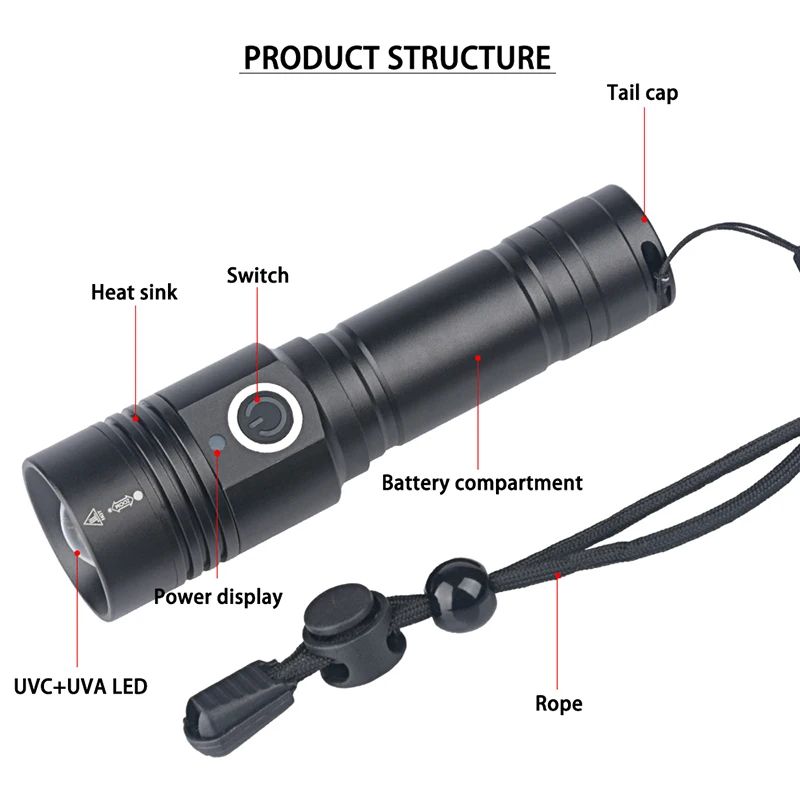 Параметры продукта2. [модель продукта]:602S-UVC3. [модель лампы]:UVC + UVA4. [Материал линз]: оптические линзы5. [Рабочая Шестерня]:1 (прочная)6. [Размер продукта]:12.2x3.3x2.4cm7. 13.2xx2.4см (длина после увеличения)8. [применимый аккумулятор]:18650x1 (без батареи)9. Класс водонепроницаемости: PX410. [мощность продукта]: 1,511. [Материал изделия: алюминиевый сплав12. [Рабочее напряжение]: 3,7 В13. [Цвет изделия: черный14. [Может быть заполнен благовонием]:USBFill непрерывно15. [Фокусировка]: Телескопический фокус16. [Расположение Kamei]: Центральный кнопочный kamei17. [Дисплей электричества]: в реальном времени зеленый свет имеет электричество, красный свет имеет недостаточную мощность18. [Упаковка фонарика: маленькая белая коробка19. [Вес нетто продукта: 118 г (один фонарик)20. [Вес брутто продукта: 140 г (факел. USBThread. Маленькая белая коробка.)21. [Вес упаковки: 170 г (факел. Usbкабель. Аккумулятор 18650. Маленькая белая коробка.)22. Особенности продукта:23. Идеально подходит для стерилизации воздуха, воды, поверхности и других сцен.24. Высокоэффективная Стерилизация: бактерицидное действие против бактерий. Стерилизация вирусов за несколько секунд, эффективность 5999%.25. Бактерицидный широкий спектр: ультрабактерицидный широкий спектр является самым высоким, это почти все бактерии. Вирусы могут быть эффективно уничтожены.26. Безопасность и охрана окружающей среды: uvcledlightuvcNo озон, без ртути, без вторичного загрязнения, настоящие три обеспечивают безопасную защиту окружающей среды.27. Может очищать органические загрязнители: эффективно удаляет формальдегид в воздухе и другие органические загрязнители, удаляет запах.28. Использование продукта:29. Облучить Экспресс-пакет и блокировать путь передачи вируса контакта; Облучить рот внутренними и внешними слоями, чтобы убить вируса, придерживающегося маски;30. Облучите экран телефона, чтобы удалить бактерии с его поверхности. Облучите сосок бутылки, чтобы предотвратить попадание энтерных бактерий.31. Облучение нижнего белья в закрытом положении для предотвращения попадания бактерий в тело