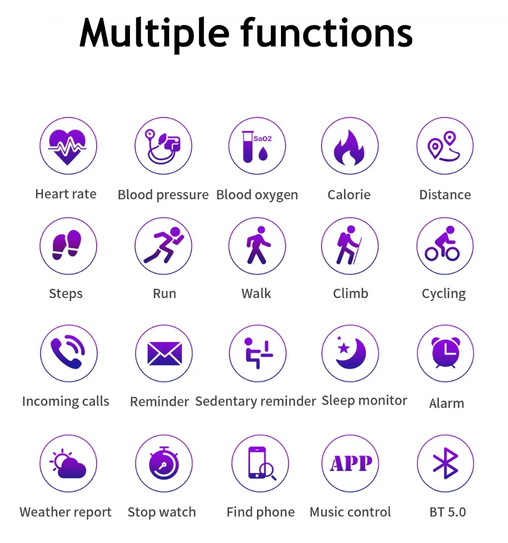 Функция K19 | Шагомер, частота сердечных сокращений, кровяное давление, время сна/ВКЛ и ВЫКЛ., время остановки, Обнаружение сна, напоминание о звонках/SMS, трёхсторонние вечерние напоминания о сообщениях, будильник, удаленная камера, напоминание о задаче |