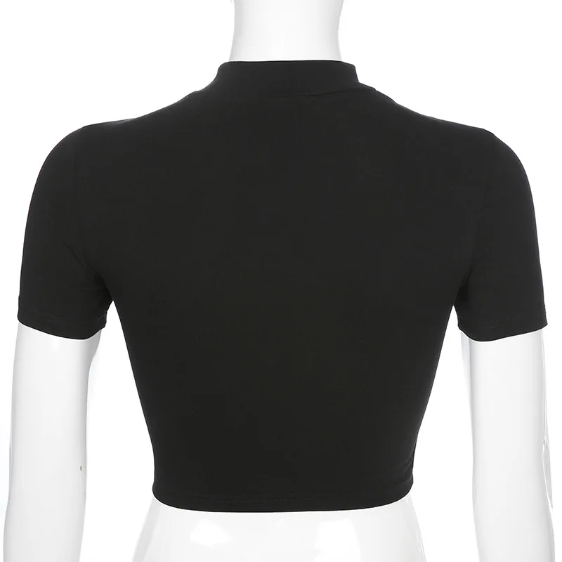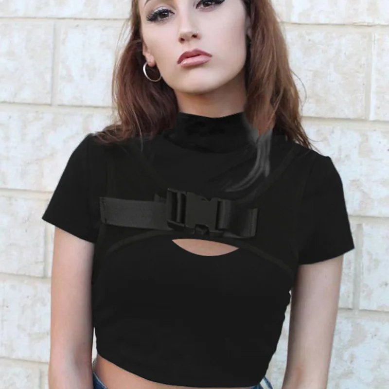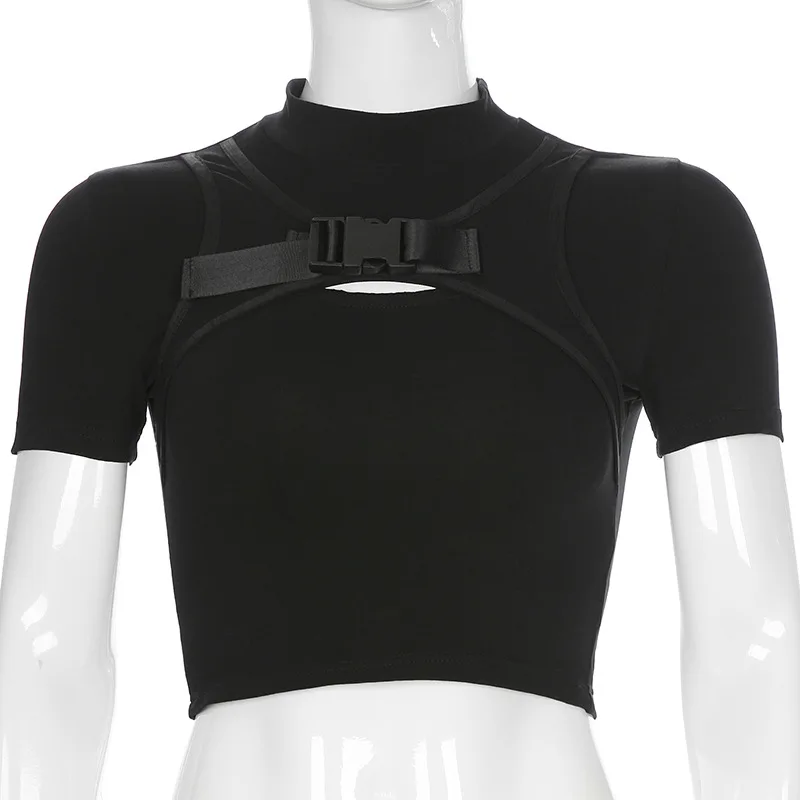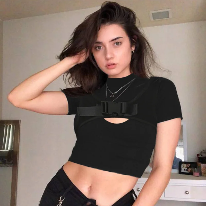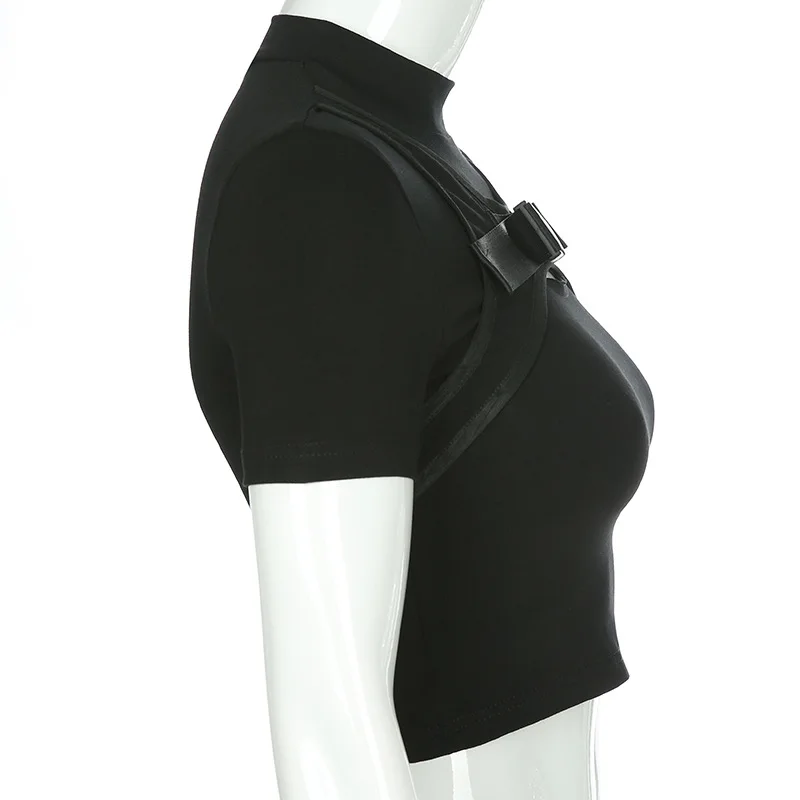 Y Demo Techwear черная футболка женская открытая Пряжка короткий рукав стойка воротник