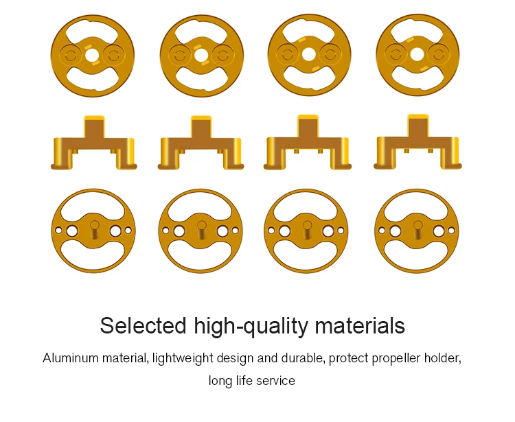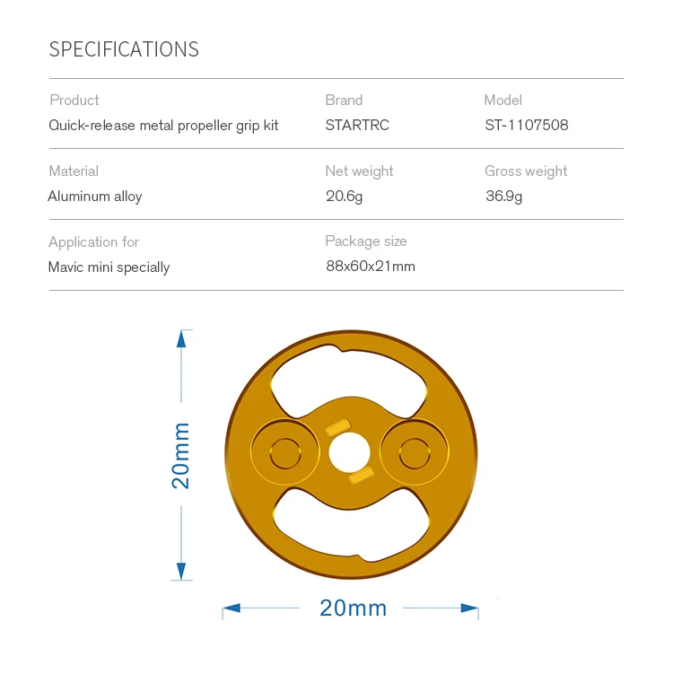 Продукт: быстроразъемный металлический комплект пропеллера Бренд: STARTRC Модель: ST-1107508 Материал: алюминиевый сплав Вес нетто: 20,6 г Вес брутто: 36,9 г Применение для: Mavic mini специально Размер посылка: 88x60x21мм