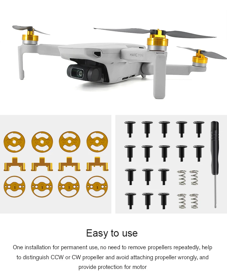 【 1 】 дизайн специально для Mavic mini Идеально подходит для mavic mini, координации и красоты с корпусом mavic mini. 【 2 】 быстроразъемный нажимной Тип Легко для быстрого крепления или крепления, уменьшает повреждение двигателя при повторном удалении пропеллеров. 【 3 】отборные высококачественные материалы Алюминиевый материал, легкий дизайн и долговечность, защитный держатель пропеллера, длительный срок службы 【 4 】 маленький размер и легкий Вес брутто комплекта составляет 20,6 г. Это не повлияет на полет Mavic mini. 【 5 】 Простота в использовании Одна установка для постоянного использования, не нужно повторно удалять пропеллеры, помогает отличить пропеллер CCW или CW и избежать неправильного крепления пропеллера и обеспечить защиту двигателя 【 6 】 быстросъемный держатель пропеллера CW Быстроразъемное основание пропеллера CW верхняя крышка Универсальная Нижняя крышка