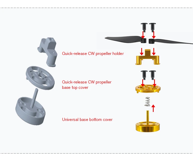 ①Освободите оригинальный винт пропеллера отверткой, а затем снимите пропеллер. ②Установите Пропеллер CW на быстроразъемный держатель пропеллера. ③ Закрепите пружину пропеллера на универсальном основании, А затем установите Быстроразъемное основание пропеллера CW (чтобы вставить 2 опорных столба в два небольших отверстия нижней крышки основания) ④Установите его на двигатель с винтом. ⑤Установка держателя пропеллера CW: Установите быстросъемный держатель пропеллера на быстроразъемную верхнюю крышку основания по часовой стрелке. Во время установки одна рука удерживает мотор, а другая-нажимает пружину, чтобы помочь установить держатель на быстроразъемную верхнюю крышку.
