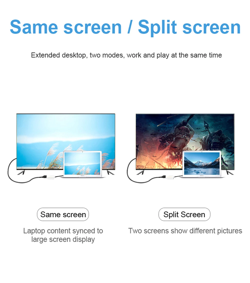 [USB C к VGA HDMI]Порт HDMI поддерживает до 4K UHD 3840 × 2160 @ 30 Гц; Дисплей VGA до 1080P @ 60 Гц full HD. Когда оба порта работают одновременно, максимальное разрешение двух-1920x1080P @ 60 Гц. Примечание: расширенный режим, в то время как vga и hdmi работают одновременно, два монитора показывают только одно и то же содержимое. (Примечание: два монитора не поддерживаются для отображения различного содержимого отдельно.)