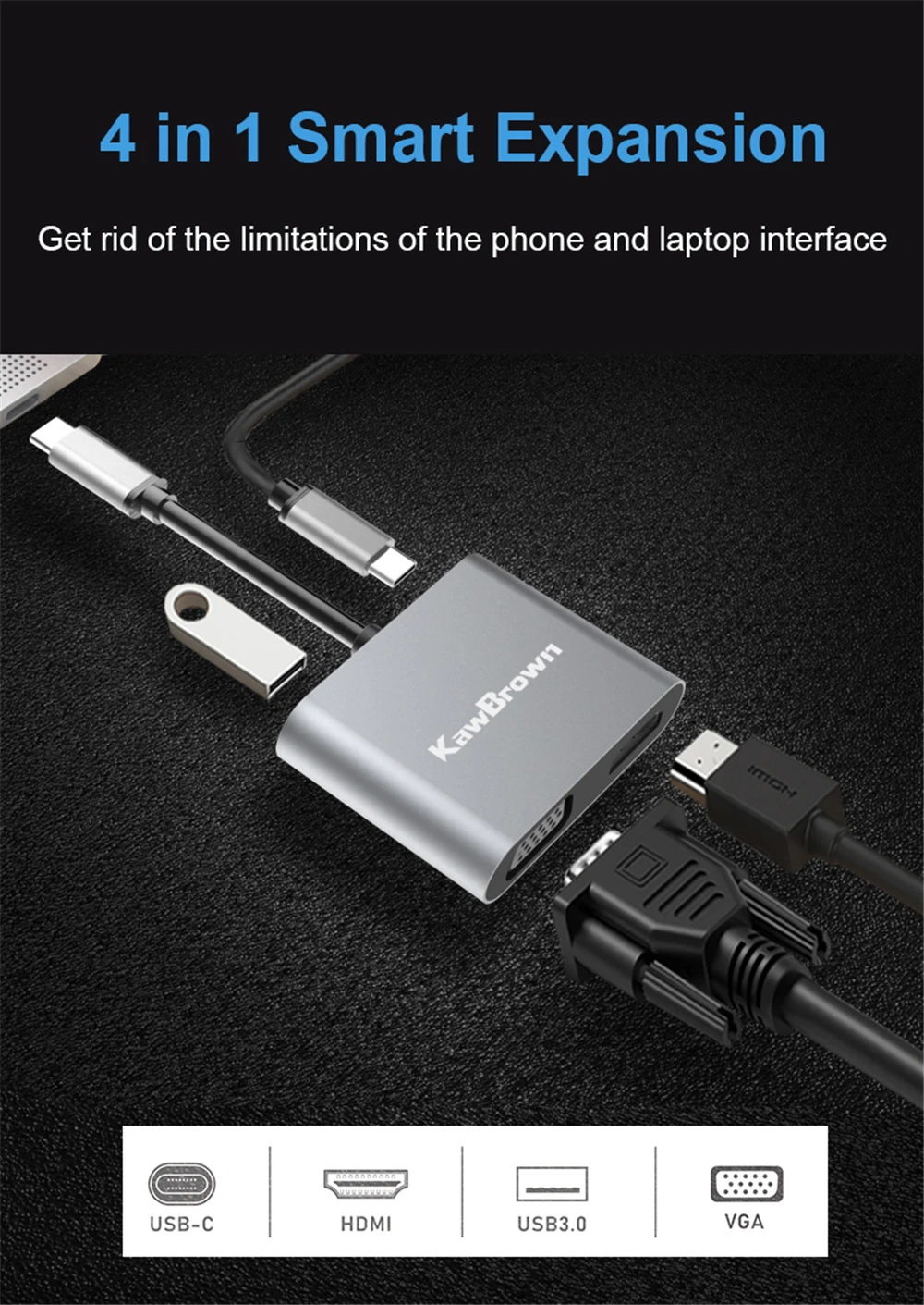 KawBrown USB C к HDMI 4K + VGA 1080P + USB 3,0 + PD для ноутбука