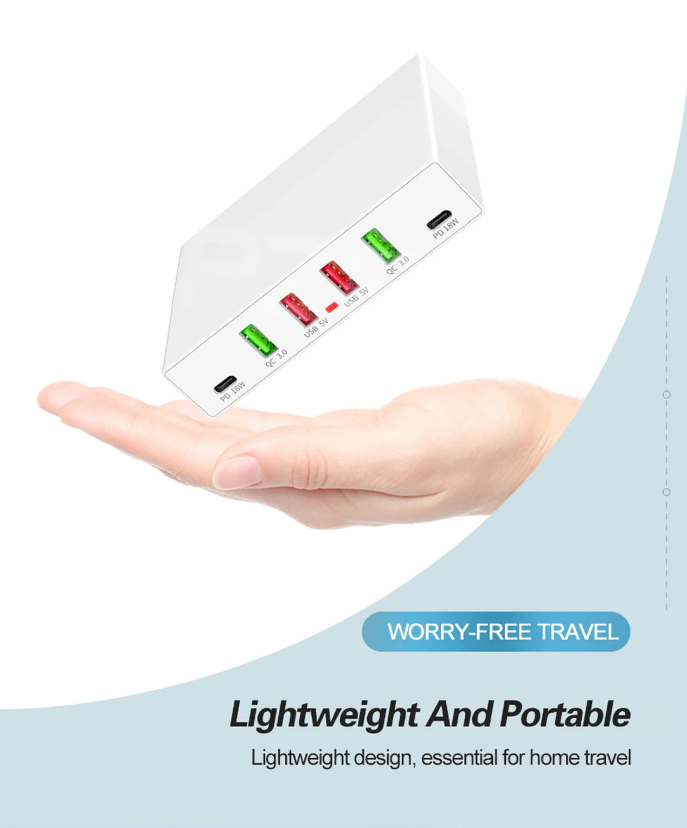 1. С 2 портами USB A, 2 портами QC3.0 и 2 портами PD3.0 2. Совместимость со всеми смартфонами, такими как iphone, Samsung, Xiaomi, Huawei, LG, Lenovo, HTC, Sony, Google и tablet PC, камера, MP3, MP4 плеер, PSP 3. Одновременно заряжайте 6 устройств. 4. Автоматическое соответствие тока, больше защиты