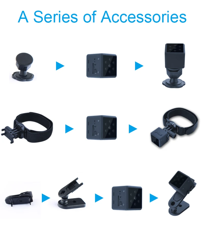 1 камера, 1 упаковочная коробка, 1 Крепежное устройство для кабеля, 1 кронштейн, 1 задний зажим, 1 Кронштейн, 1 usb-кабель, 1 Инструкция по эксплуатации, 1 повязка