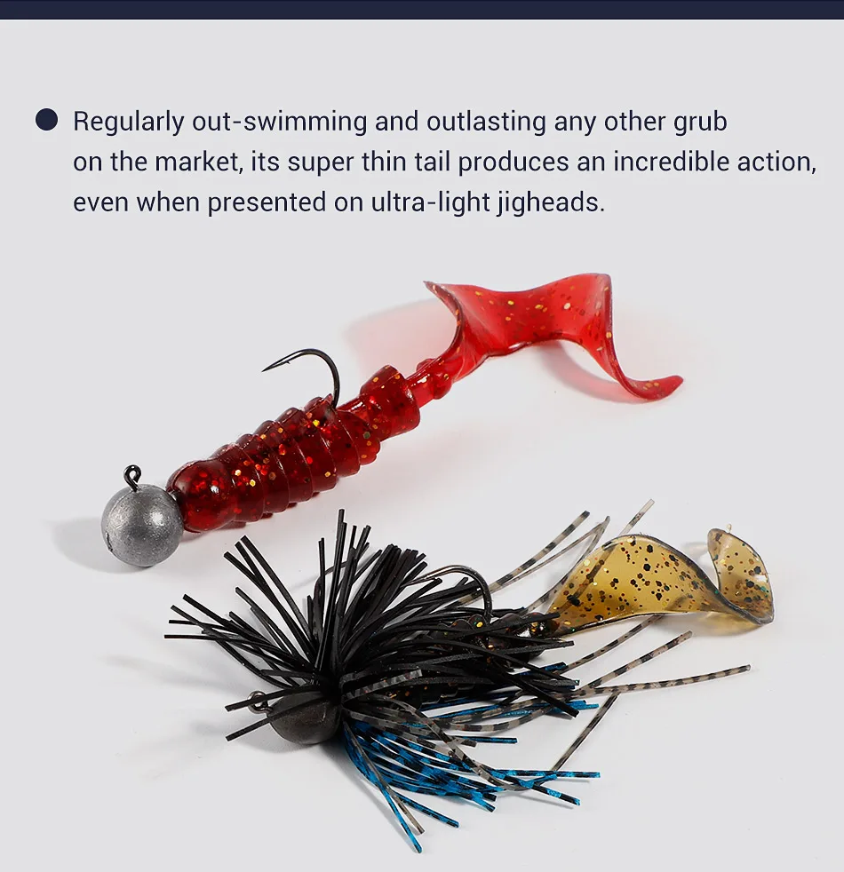 Regularly out- swimming and outlasting any other grub on the market, its super thin tail produces an incredible action, even when presented on ultra-light jigheads.