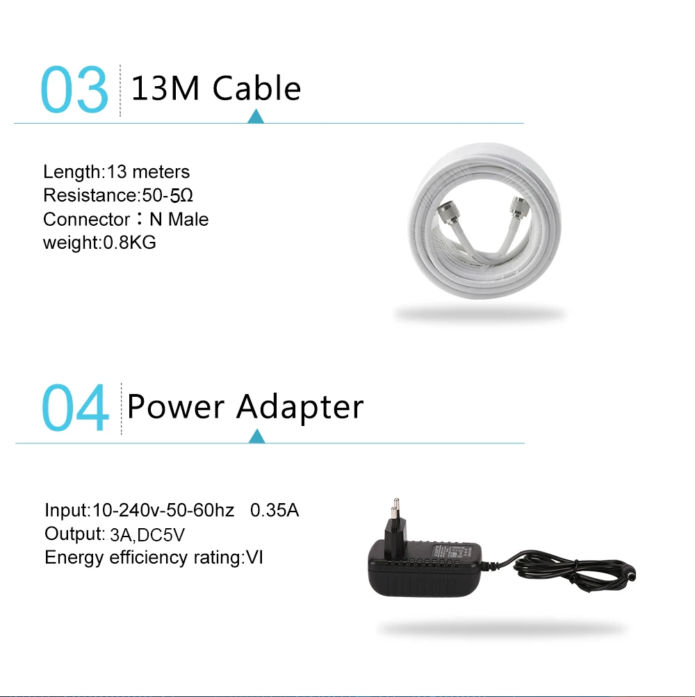 1). 1*900/1800/2100 трехдиапазонный усилитель 2). 1 * источник питания 3). 1 * Руководство пользователя на английском языке 4). 1 * Открытый LPDA антенна 5). 1 * комнатная потолочная антенна 6). 1*13 м кабель