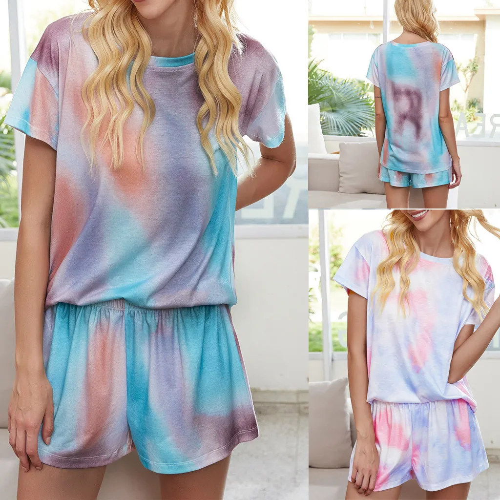 Шорты С эластичной резинкой на талии, шнурок предлагает более удобный, свободный Облегающая Пижама для сна; Комплект из топа с v-образным вырезом и короткими рукавами Шорты для расслабленной посадки, стильные Звезды иГалстук-краскаПечать.