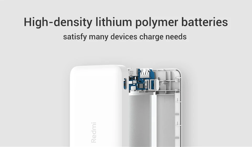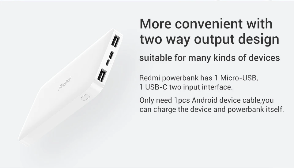 Подходит для многих видов устройств» Redmi powerbank имеет 1 Micro-USB,1 USB-C два входных интерфейса. Требуется только 1 шт. кабеля устройства Android, вы можете зарядить устройство и само зарядное устройство.
