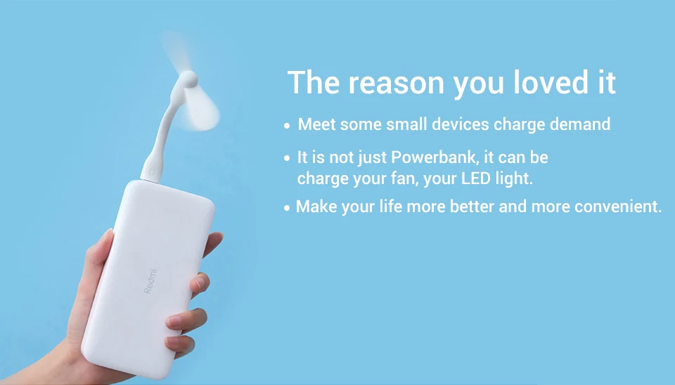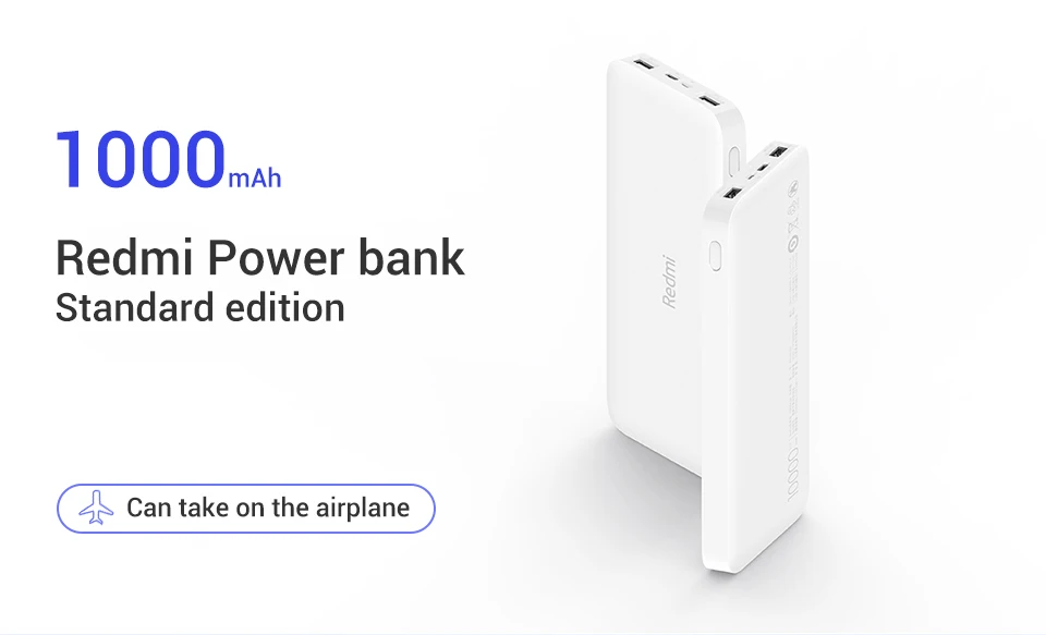 Redmi Power bank (стандартное издание) имеет двухсторонний USB-A интерфейсов вывода, может одновременно заряжать два устройства. Двусторонний выход может соответствовать 5,1 V-2 6A, удовлетворяет потребности портативного питания для вашего телефона, планшета, камеры и многого другого.