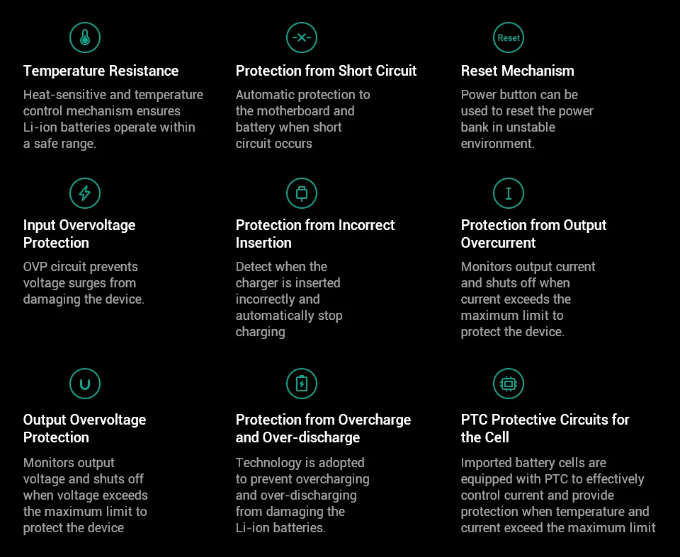 Термостойкость Защита от короткого замыкания Механизм сброса Защита от перенапряжения на входе Защита от неправильной вставки Защита от перегрузки по току Защита от перенапряжения на выходе Защита от перезаряда и переразряда Защитные схемы PTC для ячейки
