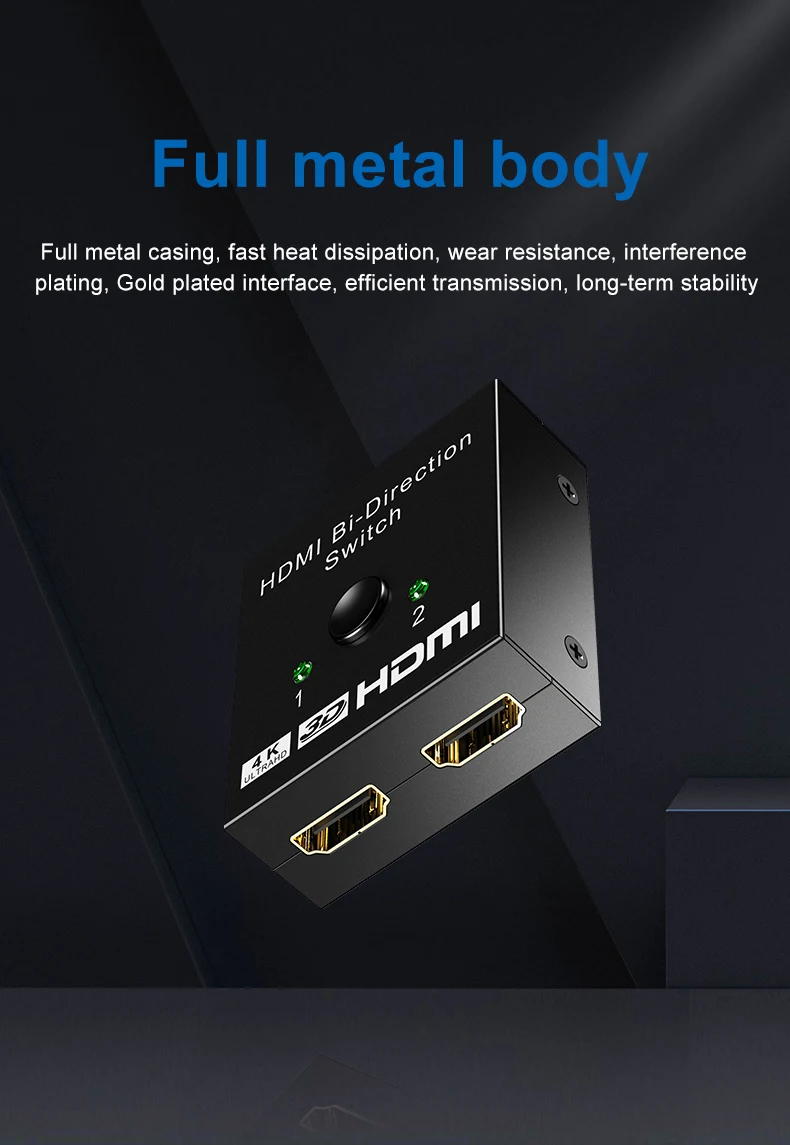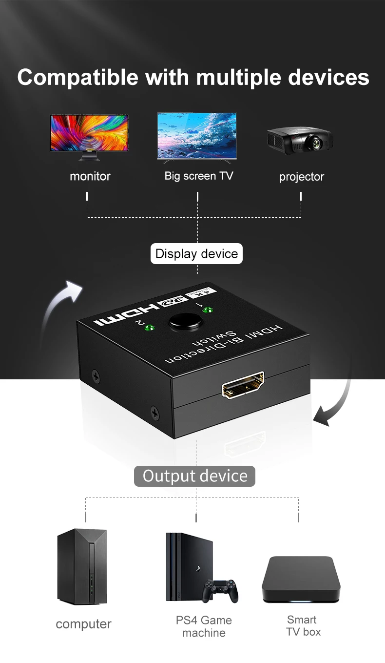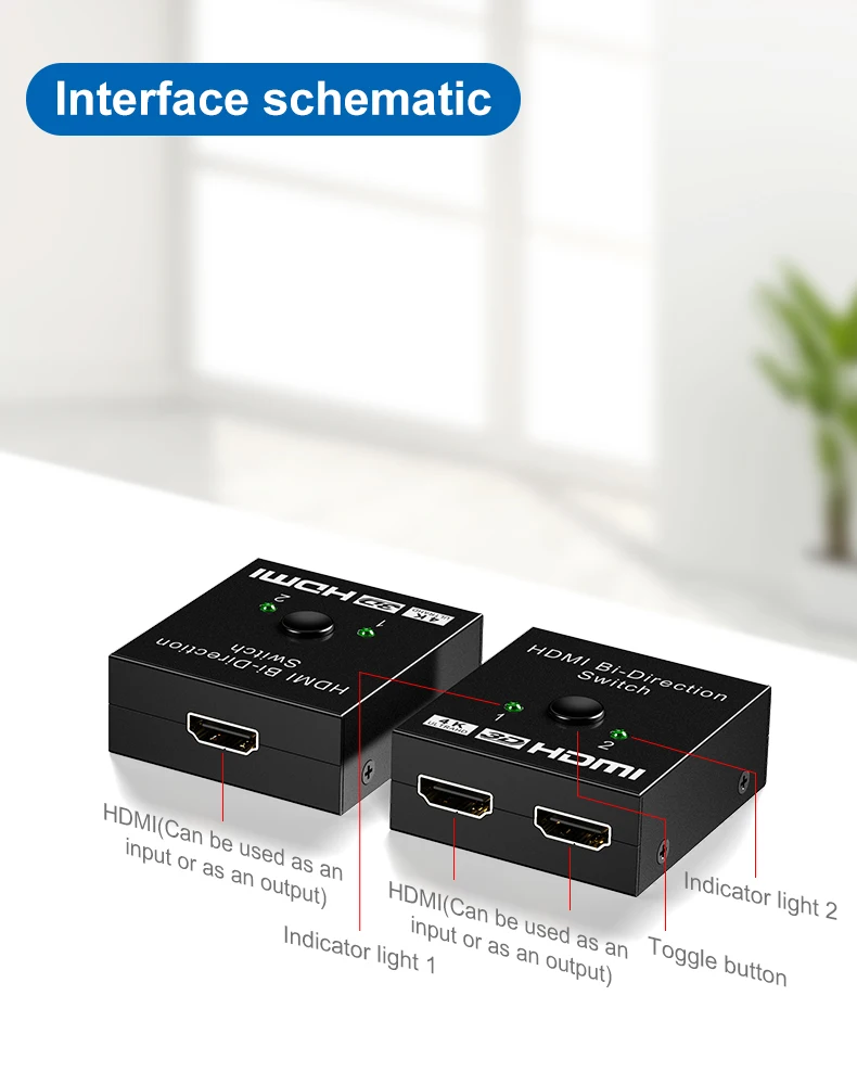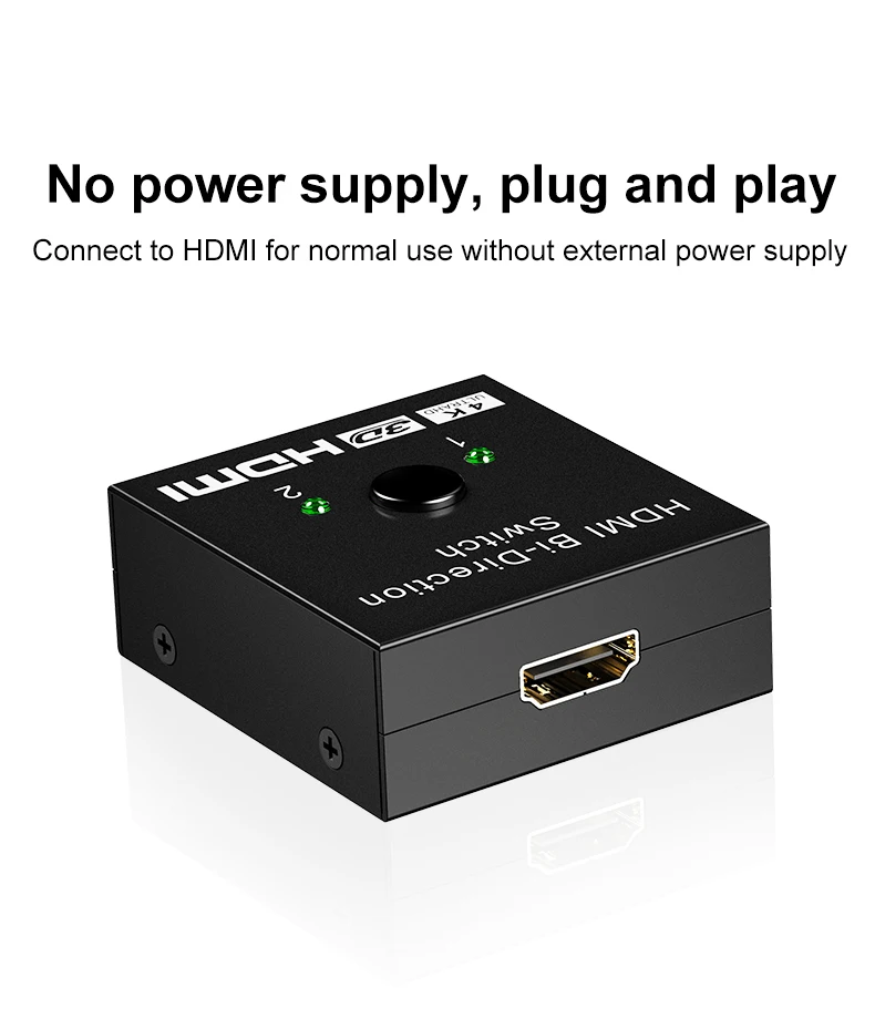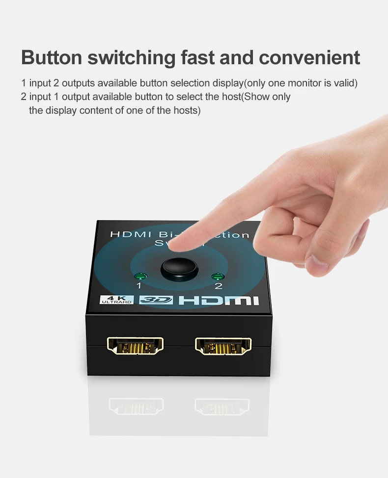 HDMI коммутатор двунаправленный HDMI коммутатор. У него есть одна кнопка включения сверху и два светодиодный световой индикатор. Кнопка на самом деле позволяет выбрать один из двух режимов: передаете ли вы сигнал от одного устройства к другому или другой способ вокруг. Это означает, что этот коммутатор двунаправленный-Сигнал HDMI может идти в любом направлении.