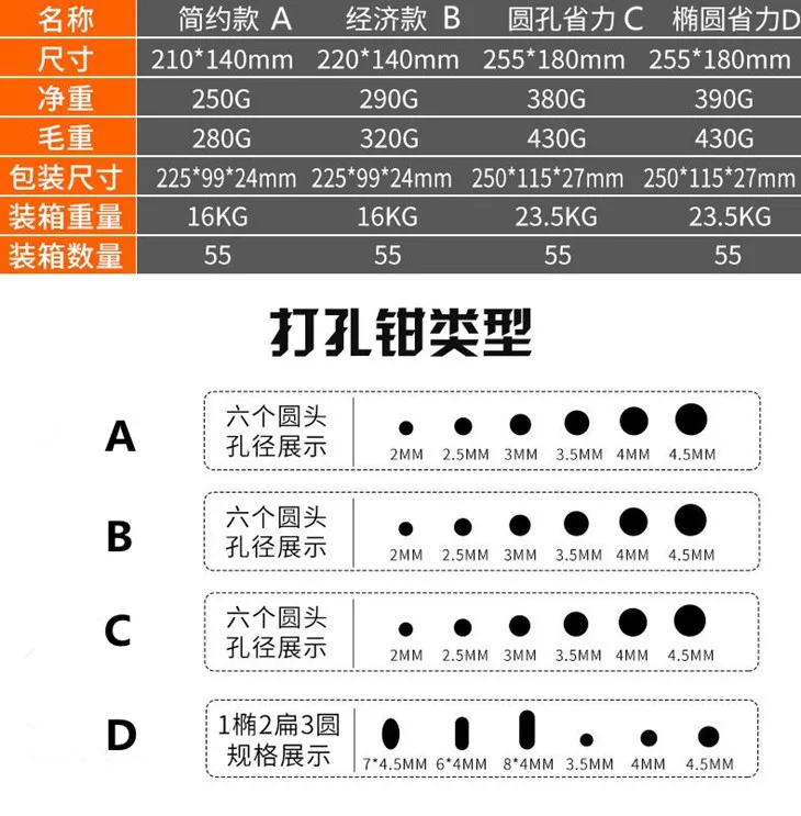 Материал: хромированная ванадиевая сталь, зажим из высокоуглеродистой стали Применимые предметы: кожа, картон и т. Д. Форма: круглое отверстие, овальное отверстие Материал ручки: Резина TPR Вес: 280 г/320 г/430 г/430 г См. Значок определенного размера