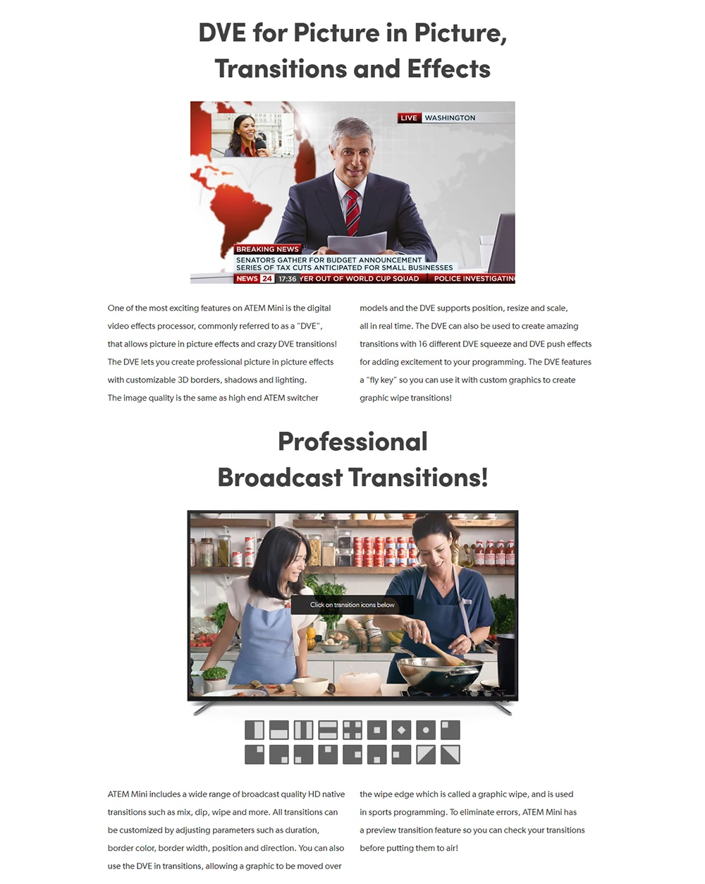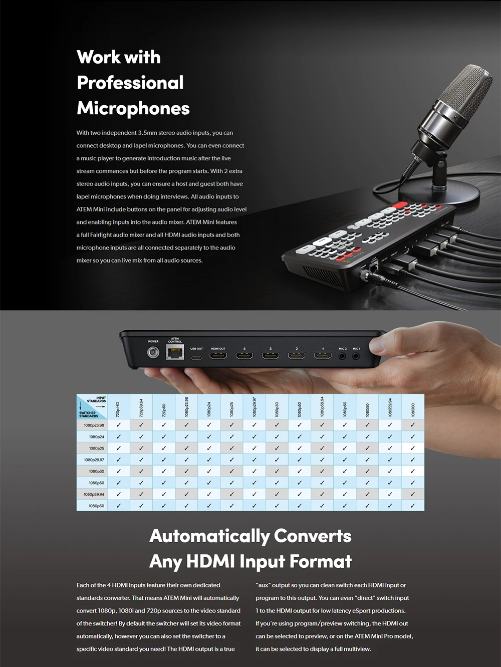 Его оригинальный Blackmagic дизайн ATEM Mini Pro и ATEM Mini, он имеет ограниченный запас, добро пожаловать, чтобы сделать заказ. Спасибо за вашу поддержку. Вопрос: Это оригинальный продукт blackmagic? О: Да, конечно. Мы продаем оригинальный 100% новый продукт. Этот продукт имеет поддельные и секонд хэнд. Вопрос: это ilock для atem mini и atem mini pro? О: мы можем отправить товар в течение 24 часов после оплаты. Вопрос: можете ли написать более низкую цену на упаковке? Ответ: без проблем. Мы можем сделать это по вашему желанию. В: почему цена такая высокая? О: потому что этот продукт Горячая Распродажа и ограниченный запас. На другом сайте есть запас, и он должен ждать более 1 месяца для доставки. Купите его быстро и получите его в ближайшее время. Это должно стоить того, чтобы купить. Любые другие вопросы, добро пожаловать в сообщение. Спасибо. Обзор Blackmagic Design ATEM Mini Pro Аналогично его предыдущей модели, ATEM Mini, ATEM Mini Pro от Blackmagic Design-это четырехвходный коммутатор прямого производства с интегрированной панелью управления, предназначенной для потоковой передачи мультикамеры в реальном времени до hd-видео в интернет или трансляции приложений с игровых консолей, корпоративный компьютерный поток, или HD камеры. Наряду с обновлением программного обеспечения, Mini Pro строится на Mini с такими функциями, как скорость передачи данных в реальном времени и информация о состоянии, Встроенный аппаратный энкодер, одновременная запись на usb-накопители, привод горячей замены с Blackmagic MultiDock, добавлены кнопки записи и потока, кэширование потока, генератор времени, Просмотр программ multiview, поддержка tally и поддержка Blackmagic Design Pocket Cinema Camera 6K и 4K для использования в качестве источников вещания. ATEM Mini Pro сохраняет ту же настройку задней панели, на которой на задней части корпуса доступны четыре hdmi-входа, и они вводят видео до 1080p HD. Также есть выход HDMI для проектора или мониторинга multiview, выход USB Type-C как для записи HD видео на компьютер, И порт Ethernet RJ45 10/100/1000 для прямой потоковой передачи, а также управления системой, дистанционного управления и обновления. Вы можете настроить частоту кадров в зависимости от качества вашего потока, и нет необходимости в дополнительной потоковой передачи программного обеспечения, потому что Pro включает Встроенный аппаратный энкодер. Обновленная панель управления программным обеспечением ATEM используется для управления и настройки ATEM Mini Pro через USB или Ethernet, и она позволяет контролировать скорость передачи данных, аудиометры, настройку, И статус вашего живого корма. Встроенная панель управления цветом имеет ту же настройку DaVinci Resolve, что устраняет любую кривую обучения. Расширенные функции включают возможность для инженеров загружать xml-файл конфигурации, чтобы облегчить изменение всех настроек сразу. Поверхность управления имеет те же простые в просмотре кнопки управления с подсветкой, которые позволяют выбирать входы камеры, управлять переходами, клавишами, настройками и DVE. ATEM Mini Pro добавляет несколько кнопок в правой части, таких как кнопка быстрой записи, которая позволяет мгновенно записывать ваш живой поток на подключенный USB источник, или удерживая его, вы можете использовать диски горячей замены при использовании Blackmagic MultiDock, если вам нужно быстро перейти к монтажу. Кнопки On Air и Stream также добавлены для мгновенного запуска и остановки потока после установки в прогр