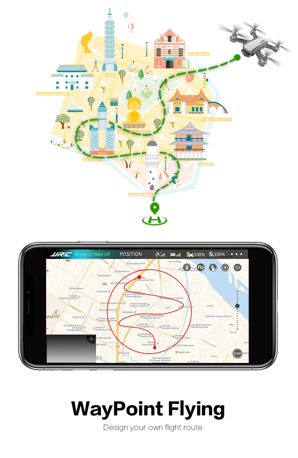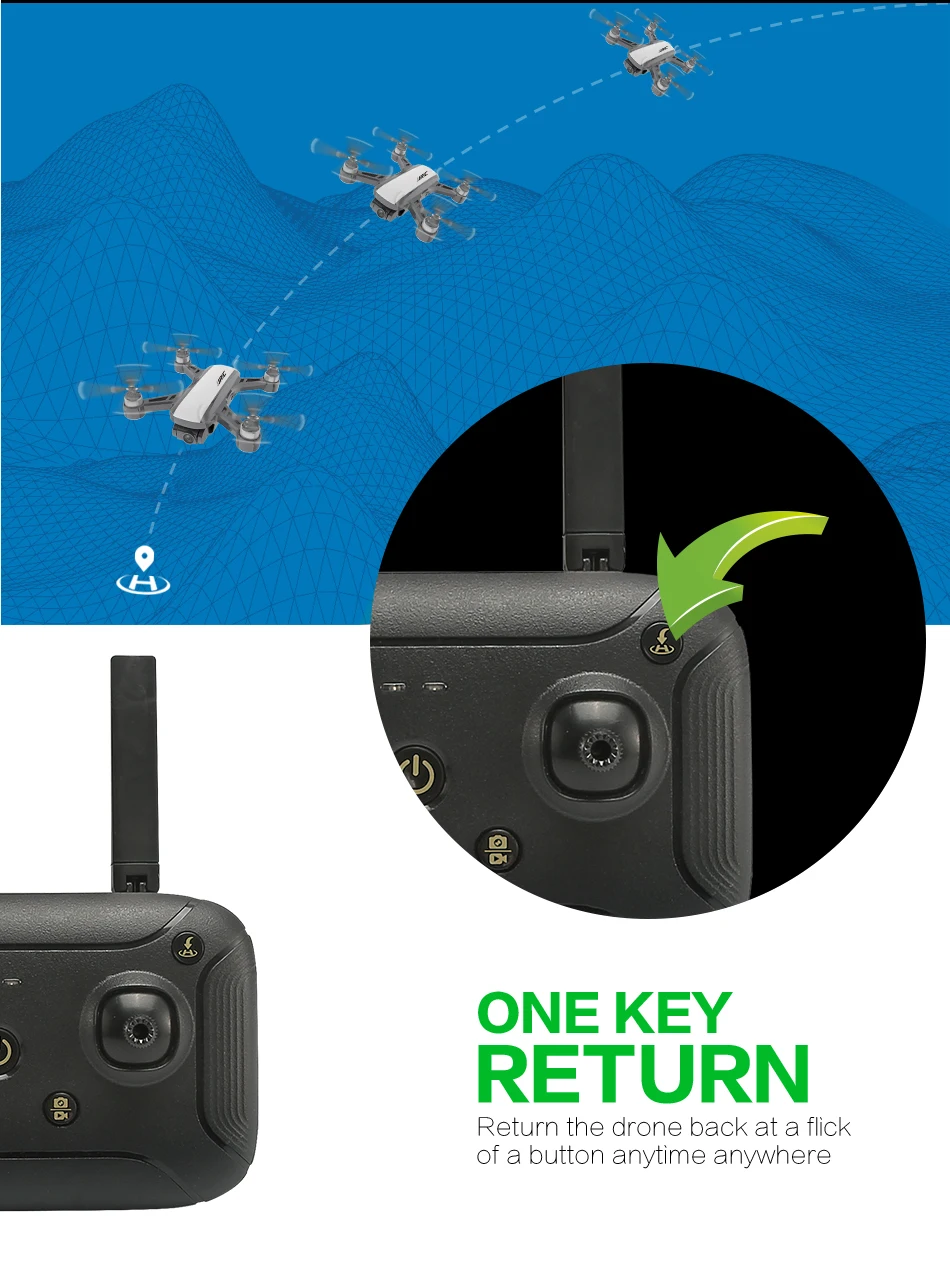Одно нажатие автоматически снимает или садится, Дрон будет снимать или возвращаться в положение, где он взлетел.