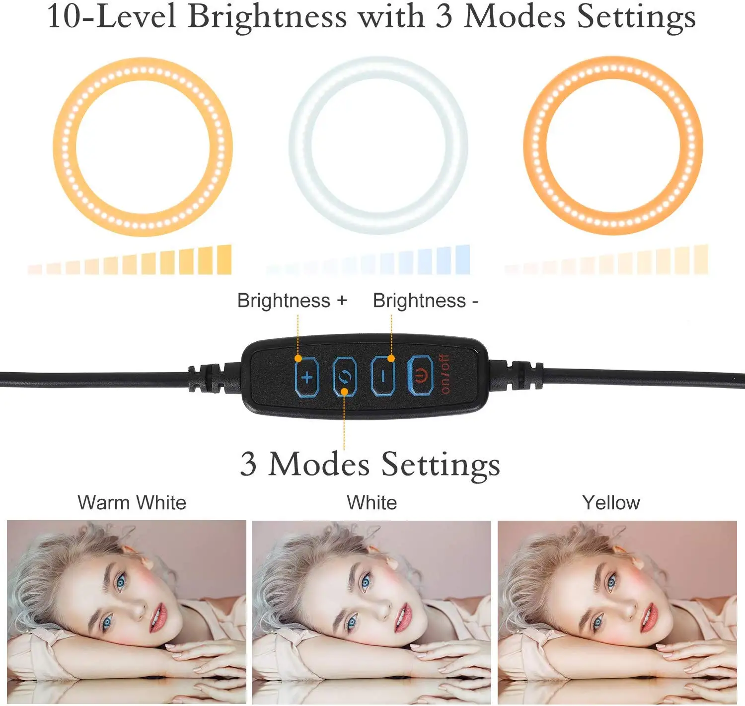 Описание: 1. Светодиодный кольцевой светильник с регулируемой яркостью 10 дюймов с широким диапазоном затемнения от 1%-100%. 2. Специальный светодиодный дизайн, легкий и портативный. Постоянный ток, низкое энергопотребление. Отсутствие ультрафиолетового и инфракрасного излучения светильник излучения, низкая теплоотдача, безопасность и защиту окружающей среды. 3. Длительный срок службы более 50000 часов. 4. С усиленной гибкой рукояткой, которая будет свободно двигаться и никогда не опускается. 5. Дополнительный длинный шнур и сверхмощные винты для большого пальца. 6. Он широко применяется для наружного фото светильник, светильник портретной съемке, на модных показах, свадьбах, рекламной съемке, съемке видео и т. д. Технические характеристики: Название товара: видео живое кольцо для селфи светильник Индикация во время зарядки: USB разъем Тип: кольцевой светильник с подставкой/кольцевой лампой для макияжа Регулируемая подставка для штатива: 70-200 см Светильник Размер: 26 см/10 в Диаметр Светильник Цвет: белый светильник, теплый светильник, мягкий светильник Материал: алюминий + ПК Диапазон затемнения: 1%-100% Цветовая температура: 3200K-5500K Светильник источник света: высокое качество светодиодный SMD Мощность: 10 Вт Светодиодный светильник: 64 шт. светодиодный s Использование: продукт/рекламная фотография, прямой светильник, косметический светильник, видео-студия для макияжа