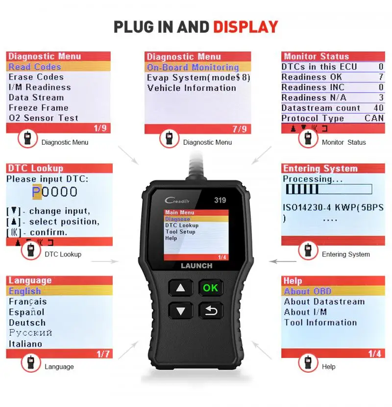 Запуск CR319, Как практичный OBD2 портативный инструмент сканирования, специально разработанный для работы с Все По каналам OBDII/может Совместимых транспортных средств, Показывая Полный функций OBDII, DTC lookup с поддержкой нескольких языков и т. Д., это отличный выбор для любых начинающих и средних автомобилей, чтобы облегчить их ремонт автомобиля. CReader 319 обеспечивает полную диагностическую функцию OBDII/EOBD и отвечает таким портам, как ISO9141-2, ISO14230-4, SAEJ1850 и ISO15765-4.