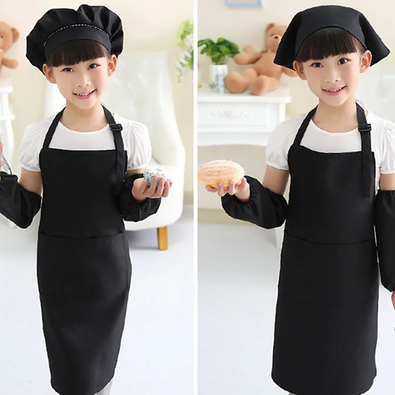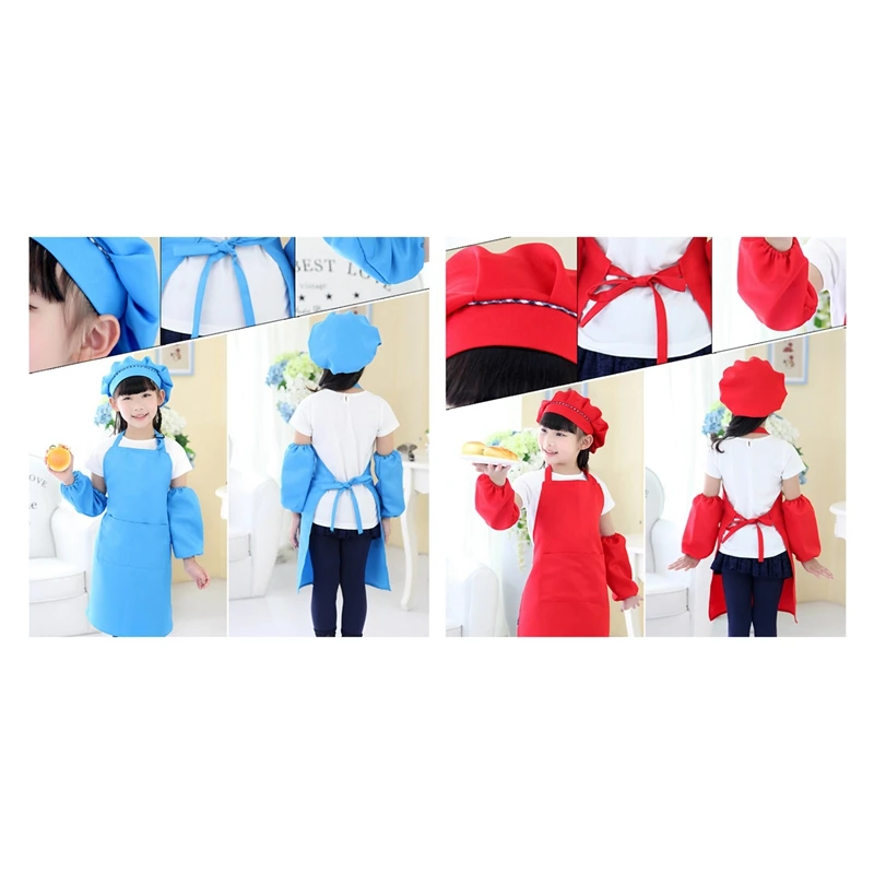2x Kids Full Apron Bib Set with Pocket and Hat Sleeves Craft Kitchen Chef Cooking Art Children Diy Apparel Blue & Red