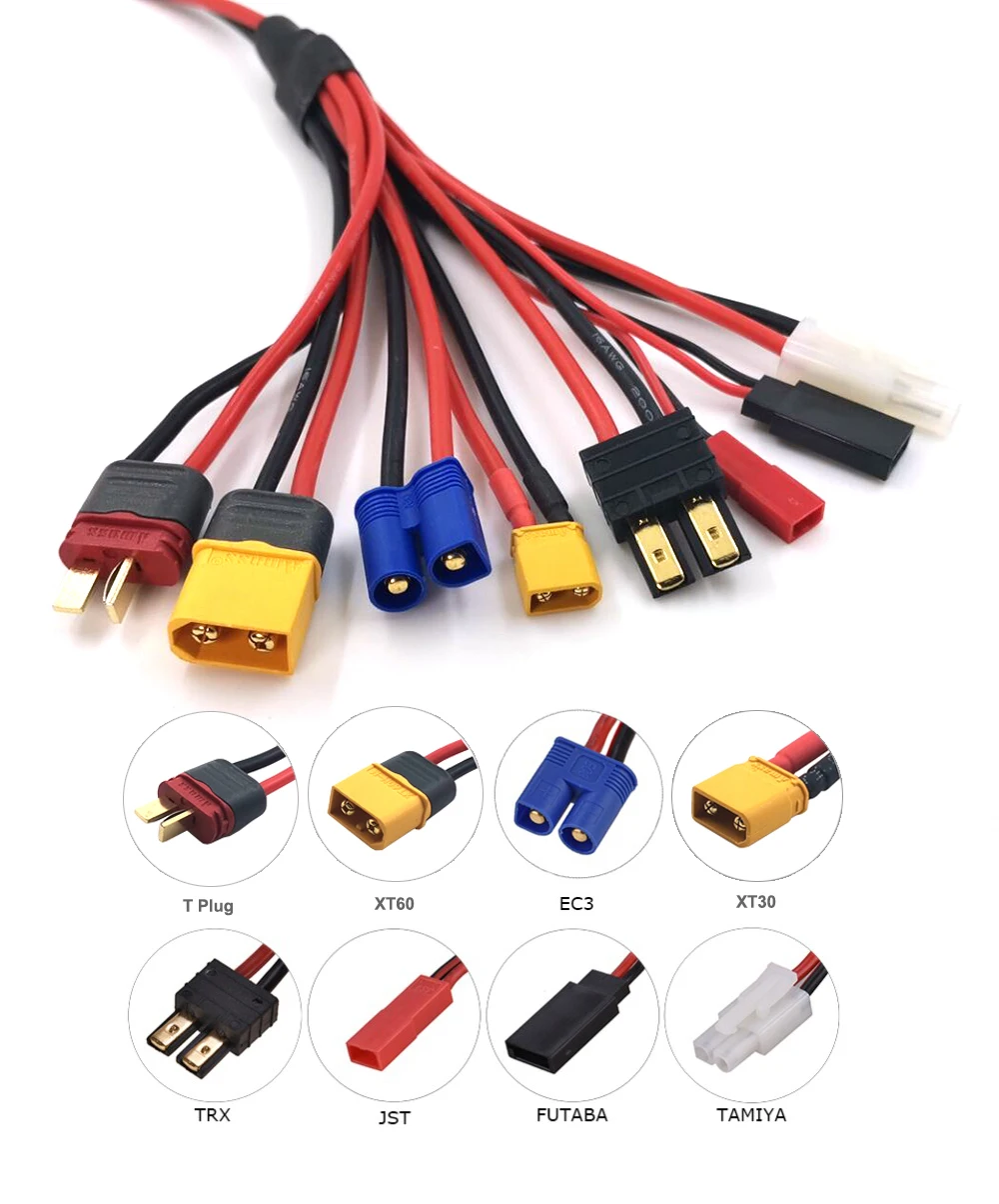 Параметры: Материал провода: Мягкий силикон Длина провода: 30 см Входной разъем: штепсельная вилка XT60 или 4 мм Цилиндрический разъем Выход разъем: T-Dean (мужской) XT60 (папа) EC3 (папа) XT30 (папа) TRX (папа) JST (женские) Futaba (женские) Tamiya по супер скидке Штепсельные вилки XT60 и T содержат штепсельную розетку, более прочные