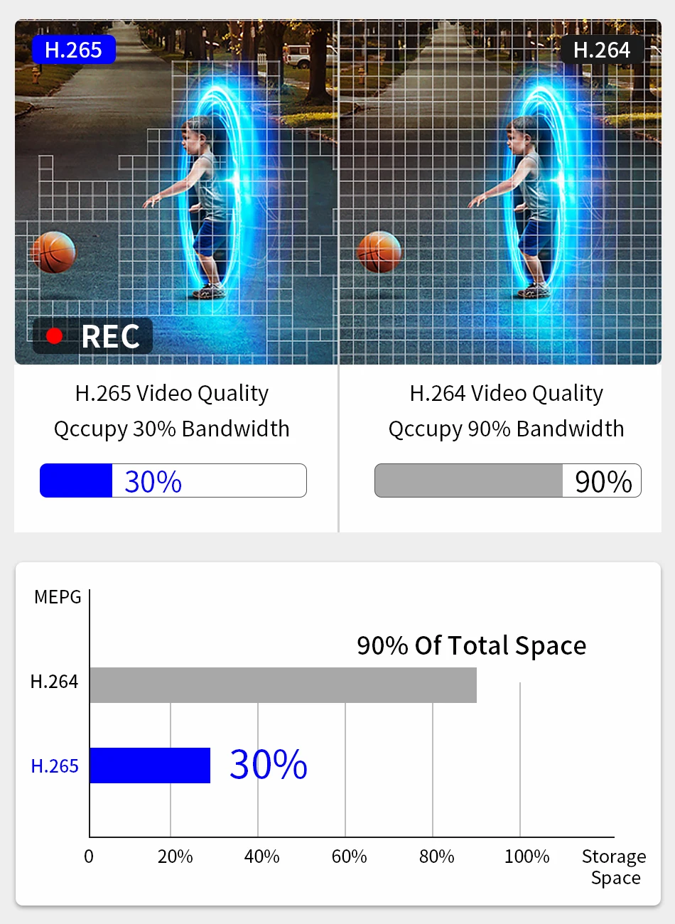 Стандартная кодировка H.265, по сравнению с кодировкой H.264, той же громкостью, поддерживает сверхвысокое разрешение 4K / 8K, обеспечивая эффективное кодирование видео при ограниченной пропускной способности.