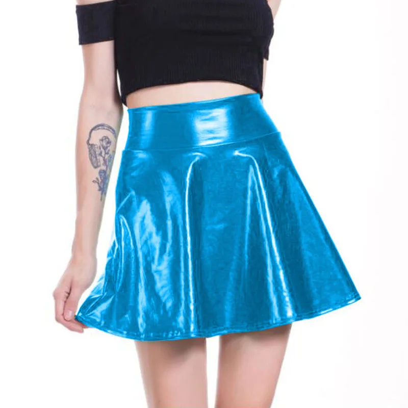 Стрейчевая мини-юбка с высокой талией, летняя модная юбка трапециевидной формы для девочек, блестящая металлическая Клубная Одежда для танцев, уличная одежда