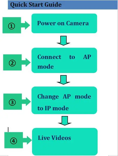 ①Power на Камера ②Connect для работы в режиме AP (как точка доступа ③Изменить режим AP на режим IP ④Live видео